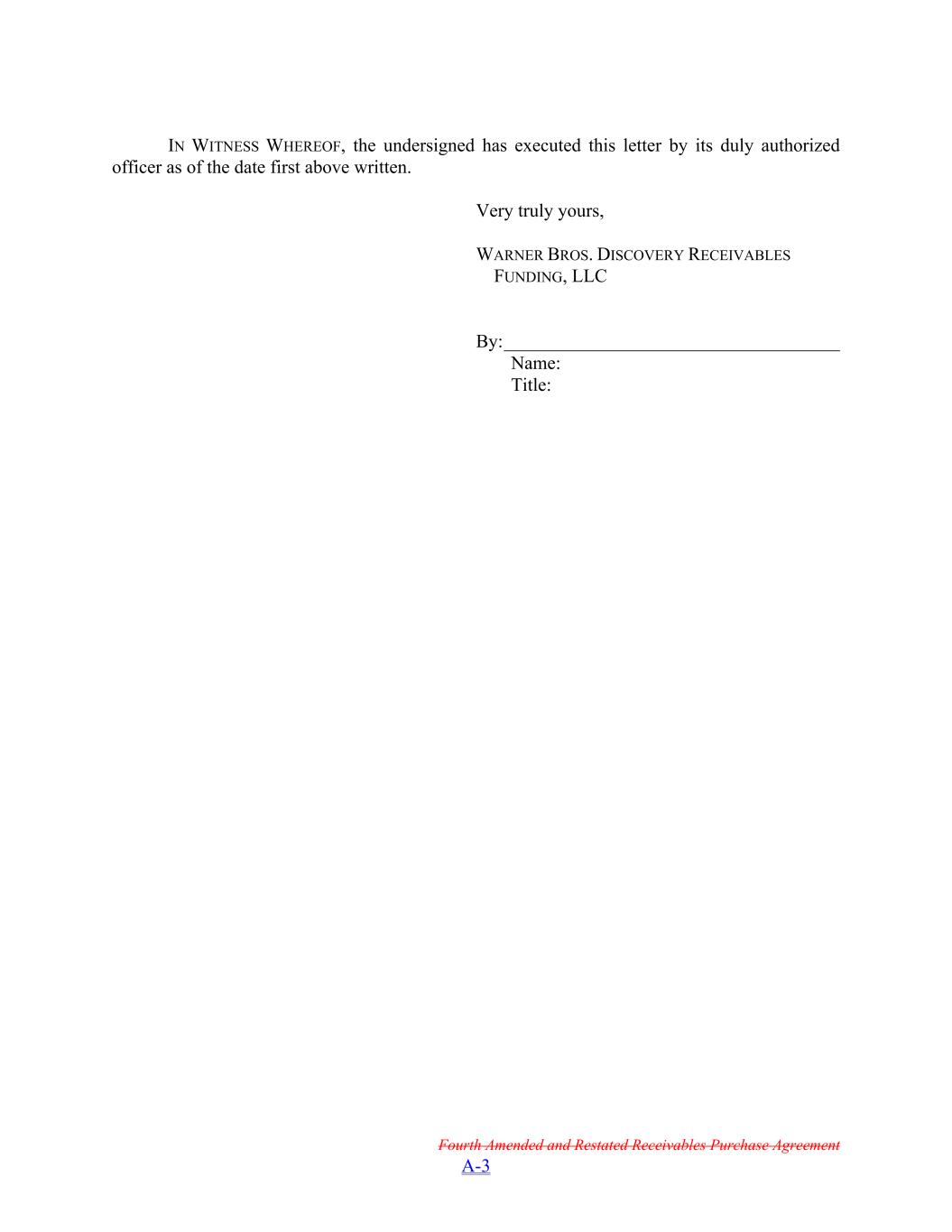 Fourth Amended and Restated Receivables Purchase Agreement A-3 IN WITNESS WHEREOF, the undersigned has executed this letter by its duly authorized officer as of the date first above written. Very truly yours, WARNER BROS. DISCOVERY RECEIVABLES FUNDING, LLC By:____________________________________ Name: Title:
