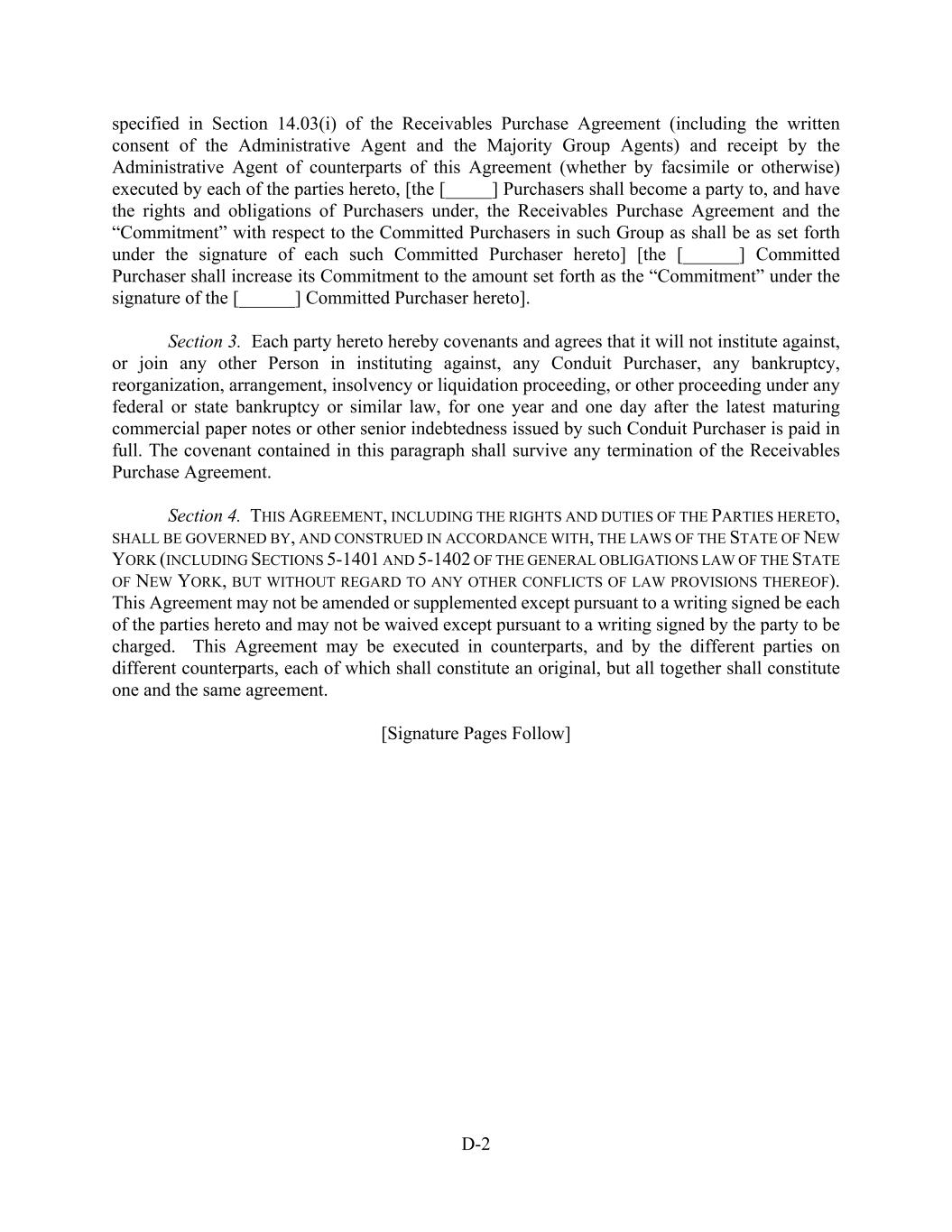 D-2 specified in Section 14.03(i) of the Receivables Purchase Agreement (including the written consent of the Administrative Agent and the Majority Group Agents) and receipt by the Administrative Agent of counterparts of this Agreement (whether by facsimile or otherwise) executed by each of the parties hereto, [the [_____] Purchasers shall become a party to, and have the rights and obligations of Purchasers under, the Receivables Purchase Agreement and the “Commitment” with respect to the Committed Purchasers in such Group as shall be as set forth under the signature of each such Committed Purchaser hereto] [the [______] Committed Purchaser shall increase its Commitment to the amount set forth as the “Commitment” under the signature of the [______] Committed Purchaser hereto]. Section 3. Each party hereto hereby covenants and agrees that it will not institute against, or join any other Person in instituting against, any Conduit Purchaser, any bankruptcy, reorganization, arrangement, insolvency or liquidation proceeding, or other proceeding under any federal or state bankruptcy or similar law, for one year and one day after the latest maturing commercial paper notes or other senior indebtedness issued by such Conduit Purchaser is paid in full. The covenant contained in this paragraph shall survive any termination of the Receivables Purchase Agreement. Section 4. THIS AGREEMENT, INCLUDING THE RIGHTS AND DUTIES OF THE PARTIES HERETO, SHALL BE GOVERNED BY, AND CONSTRUED IN ACCORDANCE WITH, THE LAWS OF THE STATE OF NEW YORK (INCLUDING SECTIONS 5-1401 AND 5-1402 OF THE GENERAL OBLIGATIONS LAW OF THE STATE OF NEW YORK, BUT WITHOUT REGARD TO ANY OTHER CONFLICTS OF LAW PROVISIONS THEREOF). This Agreement may not be amended or supplemented except pursuant to a writing signed be each of the parties hereto and may not be waived except pursuant to a writing signed by the party to be charged. This Agreement may be executed in counterparts, and by the different parties on different counterparts, each of which shall constitute an original, but all together shall constitute one and the same agreement. [Signature Pages Follow]