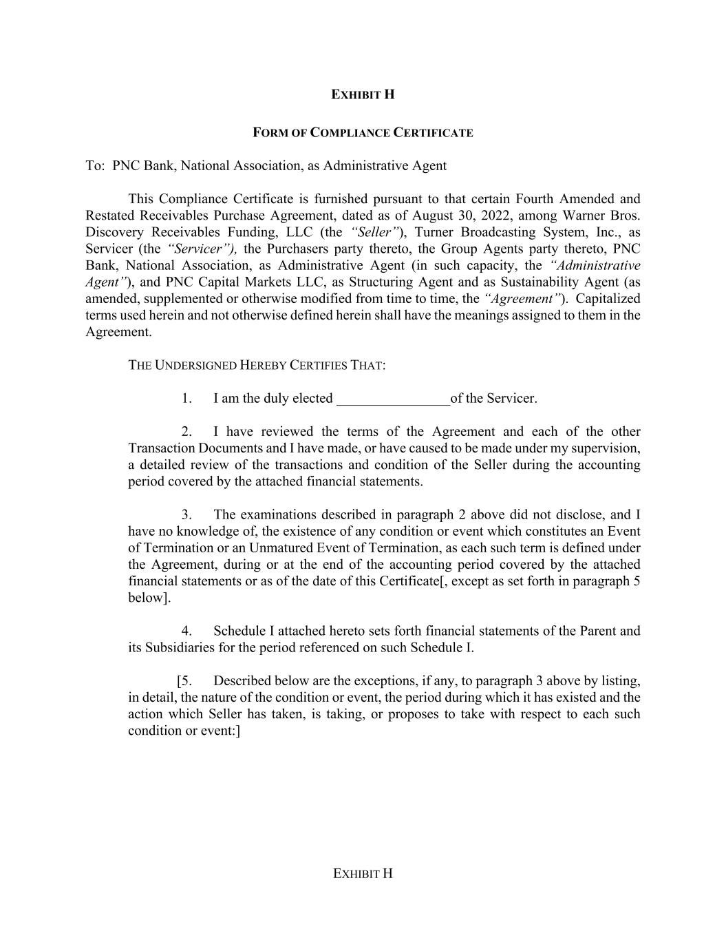 EXHIBIT H EXHIBIT H FORM OF COMPLIANCE CERTIFICATE To: PNC Bank, National Association, as Administrative Agent This Compliance Certificate is furnished pursuant to that certain Fourth Amended and Restated Receivables Purchase Agreement, dated as of August 30, 2022, among Warner Bros. Discovery Receivables Funding, LLC (the “Seller”), Turner Broadcasting System, Inc., as Servicer (the “Servicer”), the Purchasers party thereto, the Group Agents party thereto, PNC Bank, National Association, as Administrative Agent (in such capacity, the “Administrative Agent”), and PNC Capital Markets LLC, as Structuring Agent and as Sustainability Agent (as amended, supplemented or otherwise modified from time to time, the “Agreement”). Capitalized terms used herein and not otherwise defined herein shall have the meanings assigned to them in the Agreement. THE UNDERSIGNED HEREBY CERTIFIES THAT: 1. I am the duly elected ________________of the Servicer. 2. I have reviewed the terms of the Agreement and each of the other Transaction Documents and I have made, or have caused to be made under my supervision, a detailed review of the transactions and condition of the Seller during the accounting period covered by the attached financial statements. 3. The examinations described in paragraph 2 above did not disclose, and I have no knowledge of, the existence of any condition or event which constitutes an Event of Termination or an Unmatured Event of Termination, as each such term is defined under the Agreement, during or at the end of the accounting period covered by the attached financial statements or as of the date of this Certificate[, except as set forth in paragraph 5 below]. 4. Schedule I attached hereto sets forth financial statements of the Parent and its Subsidiaries for the period referenced on such Schedule I. [5. Described below are the exceptions, if any, to paragraph 3 above by listing, in detail, the nature of the condition or event, the period during which it has existed and the action which Seller has taken, is taking, or proposes to take with respect to each such condition or event:]