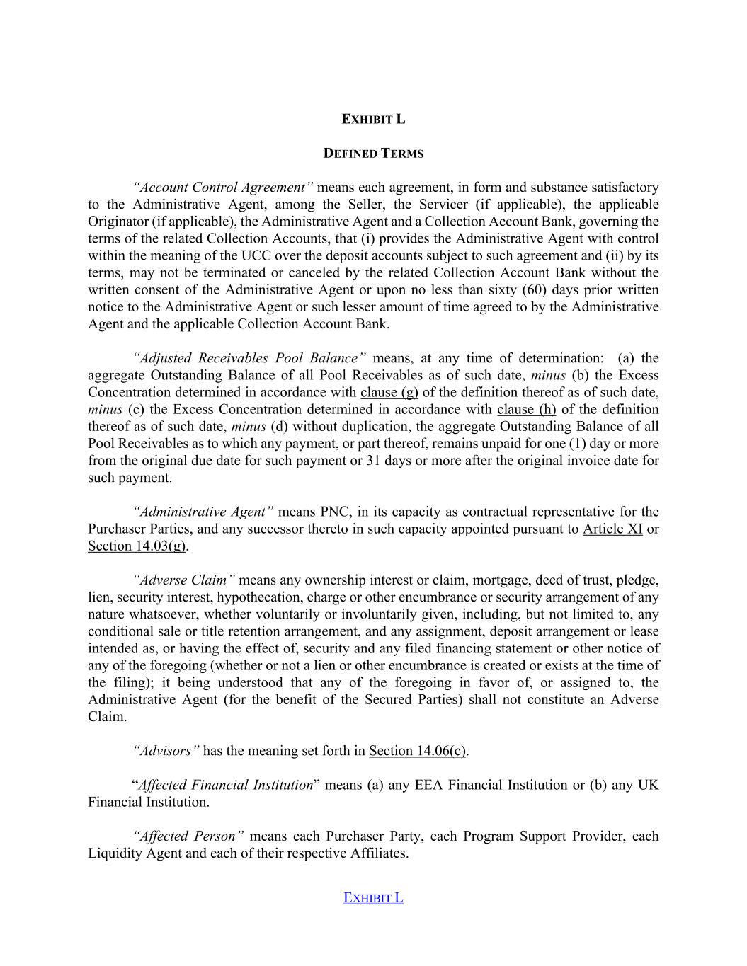 EXHIBIT L EXHIBIT L DEFINED TERMS “Account Control Agreement” means each agreement, in form and substance satisfactory to the Administrative Agent, among the Seller, the Servicer (if applicable), the applicable Originator (if applicable), the Administrative Agent and a Collection Account Bank, governing the terms of the related Collection Accounts, that (i) provides the Administrative Agent with control within the meaning of the UCC over the deposit accounts subject to such agreement and (ii) by its terms, may not be terminated or canceled by the related Collection Account Bank without the written consent of the Administrative Agent or upon no less than sixty (60) days prior written notice to the Administrative Agent or such lesser amount of time agreed to by the Administrative Agent and the applicable Collection Account Bank. “Adjusted Receivables Pool Balance” means, at any time of determination: (a) the aggregate Outstanding Balance of all Pool Receivables as of such date, minus (b) the Excess Concentration determined in accordance with clause (g) of the definition thereof as of such date, minus (c) the Excess Concentration determined in accordance with clause (h) of the definition thereof as of such date, minus (d) without duplication, the aggregate Outstanding Balance of all Pool Receivables as to which any payment, or part thereof, remains unpaid for one (1) day or more from the original due date for such payment or 31 days or more after the original invoice date for such payment. “Administrative Agent” means PNC, in its capacity as contractual representative for the Purchaser Parties, and any successor thereto in such capacity appointed pursuant to Article XI or Section 14.03(g). “Adverse Claim” means any ownership interest or claim, mortgage, deed of trust, pledge, lien, security interest, hypothecation, charge or other encumbrance or security arrangement of any nature whatsoever, whether voluntarily or involuntarily given, including, but not limited to, any conditional sale or title retention arrangement, and any assignment, deposit arrangement or lease intended as, or having the effect of, security and any filed financing statement or other notice of any of the foregoing (whether or not a lien or other encumbrance is created or exists at the time of the filing); it being understood that any of the foregoing in favor of, or assigned to, the Administrative Agent (for the benefit of the Secured Parties) shall not constitute an Adverse Claim. “Advisors” has the meaning set forth in Section 14.06(c). “Affected Financial Institution” means (a) any EEA Financial Institution or (b) any UK Financial Institution. “Affected Person” means each Purchaser Party, each Program Support Provider, each Liquidity Agent and each of their respective Affiliates.