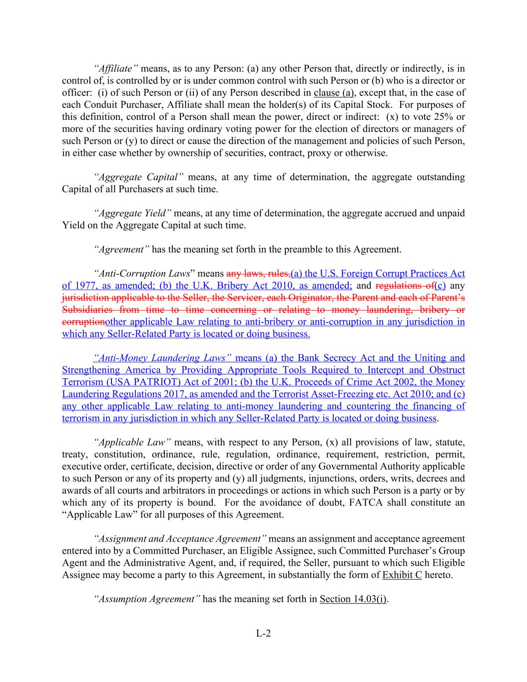 L-2 “Affiliate” means, as to any Person: (a) any other Person that, directly or indirectly, is in control of, is controlled by or is under common control with such Person or (b) who is a director or officer: (i) of such Person or (ii) of any Person described in clause (a), except that, in the case of each Conduit Purchaser, Affiliate shall mean the holder(s) of its Capital Stock. For purposes of this definition, control of a Person shall mean the power, direct or indirect: (x) to vote 25% or more of the securities having ordinary voting power for the election of directors or managers of such Person or (y) to direct or cause the direction of the management and policies of such Person, in either case whether by ownership of securities, contract, proxy or otherwise. “Aggregate Capital” means, at any time of determination, the aggregate outstanding Capital of all Purchasers at such time. “Aggregate Yield” means, at any time of determination, the aggregate accrued and unpaid Yield on the Aggregate Capital at such time. “Agreement” has the meaning set forth in the preamble to this Agreement. “Anti-Corruption Laws” means any laws, rules,(a) the U.S. Foreign Corrupt Practices Act of 1977, as amended; (b) the U.K. Bribery Act 2010, as amended; and regulations of(c) any jurisdiction applicable to the Seller, the Servicer, each Originator, the Parent and each of Parent’s Subsidiaries from time to time concerning or relating to money laundering, bribery or corruptionother applicable Law relating to anti-bribery or anti-corruption in any jurisdiction in which any Seller-Related Party is located or doing business. “Anti-Money Laundering Laws” means (a) the Bank Secrecy Act and the Uniting and Strengthening America by Providing Appropriate Tools Required to Intercept and Obstruct Terrorism (USA PATRIOT) Act of 2001; (b) the U.K. Proceeds of Crime Act 2002, the Money Laundering Regulations 2017, as amended and the Terrorist Asset-Freezing etc. Act 2010; and (c) any other applicable Law relating to anti-money laundering and countering the financing of terrorism in any jurisdiction in which any Seller-Related Party is located or doing business. “Applicable Law” means, with respect to any Person, (x) all provisions of law, statute, treaty, constitution, ordinance, rule, regulation, ordinance, requirement, restriction, permit, executive order, certificate, decision, directive or order of any Governmental Authority applicable to such Person or any of its property and (y) all judgments, injunctions, orders, writs, decrees and awards of all courts and arbitrators in proceedings or actions in which such Person is a party or by which any of its property is bound. For the avoidance of doubt, FATCA shall constitute an “Applicable Law” for all purposes of this Agreement. “Assignment and Acceptance Agreement” means an assignment and acceptance agreement entered into by a Committed Purchaser, an Eligible Assignee, such Committed Purchaser’s Group Agent and the Administrative Agent, and, if required, the Seller, pursuant to which such Eligible Assignee may become a party to this Agreement, in substantially the form of Exhibit C hereto. “Assumption Agreement” has the meaning set forth in Section 14.03(i).