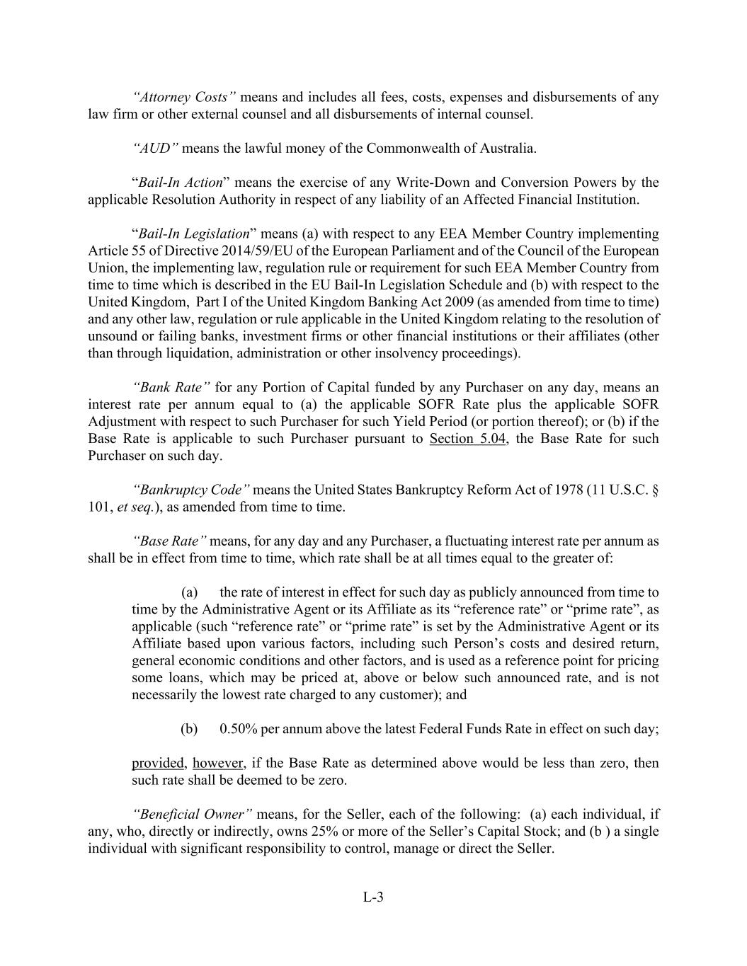 L-3 “Attorney Costs” means and includes all fees, costs, expenses and disbursements of any law firm or other external counsel and all disbursements of internal counsel. “AUD” means the lawful money of the Commonwealth of Australia. “Bail-In Action” means the exercise of any Write-Down and Conversion Powers by the applicable Resolution Authority in respect of any liability of an Affected Financial Institution. “Bail-In Legislation” means (a) with respect to any EEA Member Country implementing Article 55 of Directive 2014/59/EU of the European Parliament and of the Council of the European Union, the implementing law, regulation rule or requirement for such EEA Member Country from time to time which is described in the EU Bail-In Legislation Schedule and (b) with respect to the United Kingdom, Part I of the United Kingdom Banking Act 2009 (as amended from time to time) and any other law, regulation or rule applicable in the United Kingdom relating to the resolution of unsound or failing banks, investment firms or other financial institutions or their affiliates (other than through liquidation, administration or other insolvency proceedings). “Bank Rate” for any Portion of Capital funded by any Purchaser on any day, means an interest rate per annum equal to (a) the applicable SOFR Rate plus the applicable SOFR Adjustment with respect to such Purchaser for such Yield Period (or portion thereof); or (b) if the Base Rate is applicable to such Purchaser pursuant to Section 5.04, the Base Rate for such Purchaser on such day. “Bankruptcy Code” means the United States Bankruptcy Reform Act of 1978 (11 U.S.C. § 101, et seq.), as amended from time to time. “Base Rate” means, for any day and any Purchaser, a fluctuating interest rate per annum as shall be in effect from time to time, which rate shall be at all times equal to the greater of: (a) the rate of interest in effect for such day as publicly announced from time to time by the Administrative Agent or its Affiliate as its “reference rate” or “prime rate”, as applicable (such “reference rate” or “prime rate” is set by the Administrative Agent or its Affiliate based upon various factors, including such Person’s costs and desired return, general economic conditions and other factors, and is used as a reference point for pricing some loans, which may be priced at, above or below such announced rate, and is not necessarily the lowest rate charged to any customer); and (b) 0.50% per annum above the latest Federal Funds Rate in effect on such day; provided, however, if the Base Rate as determined above would be less than zero, then such rate shall be deemed to be zero. “Beneficial Owner” means, for the Seller, each of the following: (a) each individual, if any, who, directly or indirectly, owns 25% or more of the Seller’s Capital Stock; and (b ) a single individual with significant responsibility to control, manage or direct the Seller.