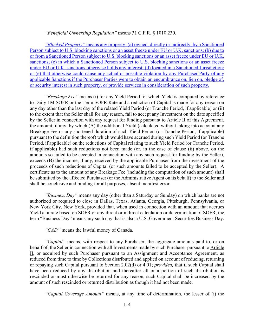 L-4 “Beneficial Ownership Regulation” means 31 C.F.R. § 1010.230. “Blocked Property” means any property: (a) owned, directly or indirectly, by a Sanctioned Person subject to U.S. blocking sanctions or an asset freeze under EU or U.K. sanctions; (b) due to or from a Sanctioned Person subject to U.S. blocking sanctions or an asset freeze under EU or U.K. sanctions; (c) in which a Sanctioned Person subject to U.S. blocking sanctions or an asset freeze under EU or U.K. sanctions otherwise holds any interest; (d) located in a Sanctioned Jurisdiction; or (e) that otherwise could cause any actual or possible violation by any Purchaser Party of any applicable Sanctions if the Purchaser Parties were to obtain an encumbrance on, lien on, pledge of, or security interest in such property, or provide services in consideration of such property. “Breakage Fee” means (i) for any Yield Period for which Yield is computed by reference to Daily 1M SOFR or the Term SOFR Rate and a reduction of Capital is made for any reason on any day other than the last day of the related Yield Period (or Tranche Period, if applicable) or (ii) to the extent that the Seller shall for any reason, fail to accept any Investment on the date specified by the Seller in connection with any request for funding pursuant to Article II of this Agreement, the amount, if any, by which (A) the additional Yield (calculated without taking into account any Breakage Fee or any shortened duration of such Yield Period (or Tranche Period, if applicable) pursuant to the definition thereof) which would have accrued during such Yield Period (or Tranche Period, if applicable) on the reductions of Capital relating to such Yield Period (or Tranche Period, if applicable) had such reductions not been made (or, in the case of clause (ii) above, on the amounts so failed to be accepted in connection with any such request for funding by the Seller), exceeds (B) the income, if any, received by the applicable Purchaser from the investment of the proceeds of such reductions of Capital (or such amounts failed to be accepted by the Seller). A certificate as to the amount of any Breakage Fee (including the computation of such amount) shall be submitted by the affected Purchaser (or the Administrative Agent on its behalf) to the Seller and shall be conclusive and binding for all purposes, absent manifest error. “Business Day” means any day (other than a Saturday or Sunday) on which banks are not authorized or required to close in Dallas, Texas, Atlanta, Georgia, Pittsburgh, Pennsylvania, or New York City, New York, provided that, when used in connection with an amount that accrues Yield at a rate based on SOFR or any direct or indirect calculation or determination of SOFR, the term “Business Day” means any such day that is also a U.S. Government Securities Business Day. “CAD” means the lawful money of Canada. “Capital” means, with respect to any Purchaser, the aggregate amounts paid to, or on behalf of, the Seller in connection with all Investments made by such Purchaser pursuant to Article II, or acquired by such Purchaser pursuant to an Assignment and Acceptance Agreement, as reduced from time to time by Collections distributed and applied on account of reducing, returning or repaying such Capital pursuant to Section 2.02(d) or 4.01; provided, that if such Capital shall have been reduced by any distribution and thereafter all or a portion of such distribution is rescinded or must otherwise be returned for any reason, such Capital shall be increased by the amount of such rescinded or returned distribution as though it had not been made. “Capital Coverage Amount” means, at any time of determination, the lesser of (i) the