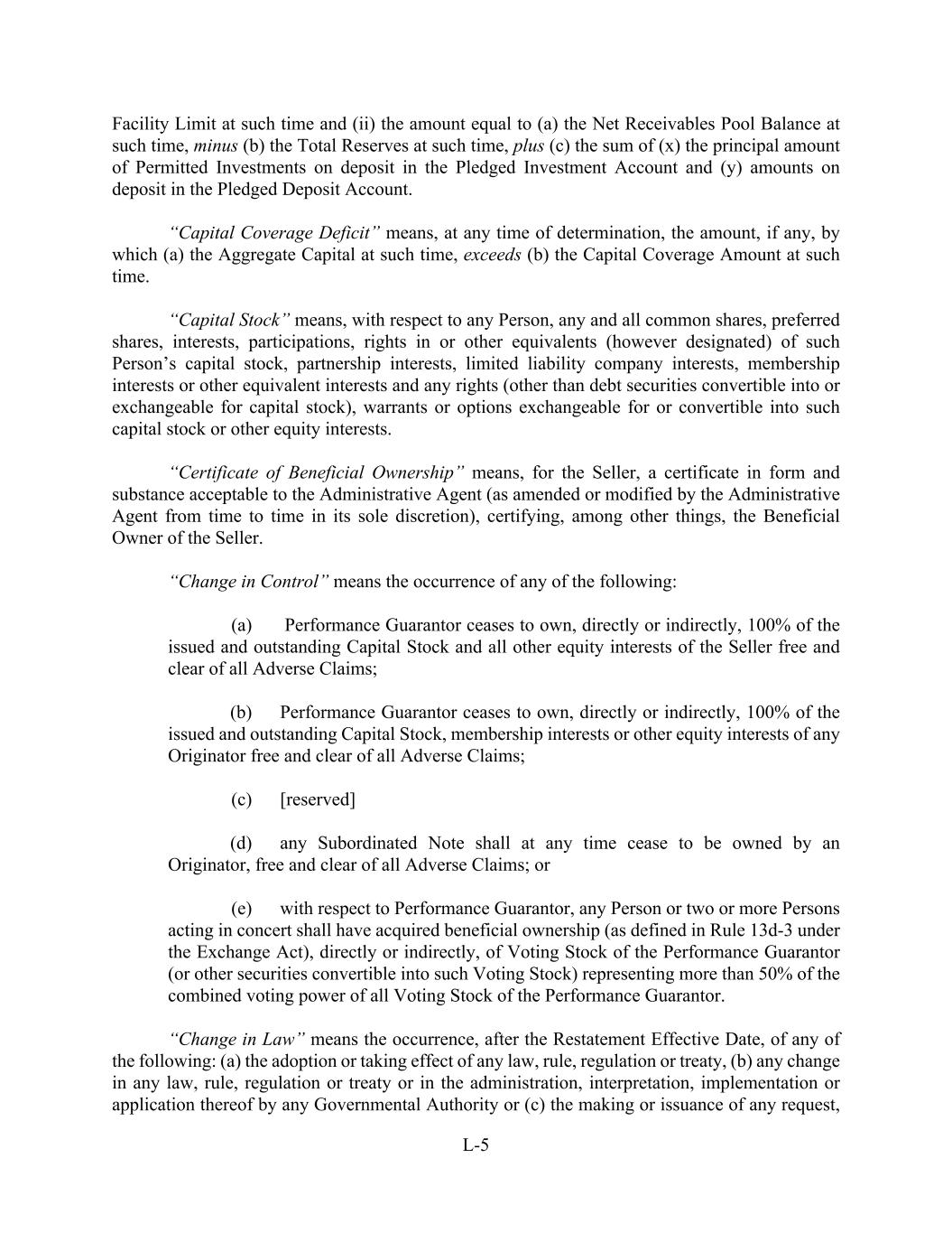 L-5 Facility Limit at such time and (ii) the amount equal to (a) the Net Receivables Pool Balance at such time, minus (b) the Total Reserves at such time, plus (c) the sum of (x) the principal amount of Permitted Investments on deposit in the Pledged Investment Account and (y) amounts on deposit in the Pledged Deposit Account. “Capital Coverage Deficit” means, at any time of determination, the amount, if any, by which (a) the Aggregate Capital at such time, exceeds (b) the Capital Coverage Amount at such time. “Capital Stock” means, with respect to any Person, any and all common shares, preferred shares, interests, participations, rights in or other equivalents (however designated) of such Person’s capital stock, partnership interests, limited liability company interests, membership interests or other equivalent interests and any rights (other than debt securities convertible into or exchangeable for capital stock), warrants or options exchangeable for or convertible into such capital stock or other equity interests. “Certificate of Beneficial Ownership” means, for the Seller, a certificate in form and substance acceptable to the Administrative Agent (as amended or modified by the Administrative Agent from time to time in its sole discretion), certifying, among other things, the Beneficial Owner of the Seller. “Change in Control” means the occurrence of any of the following: (a) Performance Guarantor ceases to own, directly or indirectly, 100% of the issued and outstanding Capital Stock and all other equity interests of the Seller free and clear of all Adverse Claims; (b) Performance Guarantor ceases to own, directly or indirectly, 100% of the issued and outstanding Capital Stock, membership interests or other equity interests of any Originator free and clear of all Adverse Claims; (c) [reserved] (d) any Subordinated Note shall at any time cease to be owned by an Originator, free and clear of all Adverse Claims; or (e) with respect to Performance Guarantor, any Person or two or more Persons acting in concert shall have acquired beneficial ownership (as defined in Rule 13d-3 under the Exchange Act), directly or indirectly, of Voting Stock of the Performance Guarantor (or other securities convertible into such Voting Stock) representing more than 50% of the combined voting power of all Voting Stock of the Performance Guarantor. “Change in Law” means the occurrence, after the Restatement Effective Date, of any of the following: (a) the adoption or taking effect of any law, rule, regulation or treaty, (b) any change in any law, rule, regulation or treaty or in the administration, interpretation, implementation or application thereof by any Governmental Authority or (c) the making or issuance of any request,