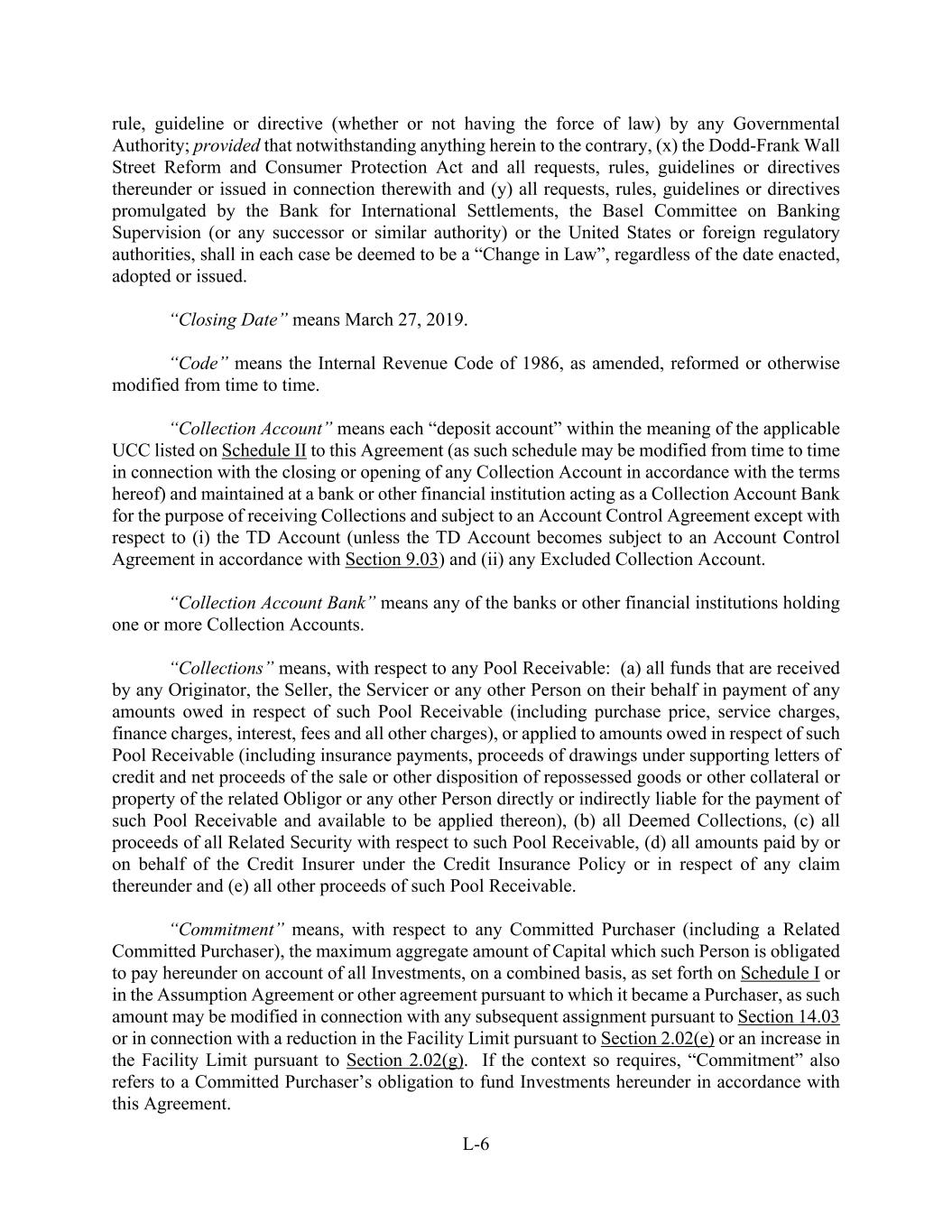 L-6 rule, guideline or directive (whether or not having the force of law) by any Governmental Authority; provided that notwithstanding anything herein to the contrary, (x) the Dodd-Frank Wall Street Reform and Consumer Protection Act and all requests, rules, guidelines or directives thereunder or issued in connection therewith and (y) all requests, rules, guidelines or directives promulgated by the Bank for International Settlements, the Basel Committee on Banking Supervision (or any successor or similar authority) or the United States or foreign regulatory authorities, shall in each case be deemed to be a “Change in Law”, regardless of the date enacted, adopted or issued. “Closing Date” means March 27, 2019. “Code” means the Internal Revenue Code of 1986, as amended, reformed or otherwise modified from time to time. “Collection Account” means each “deposit account” within the meaning of the applicable UCC listed on Schedule II to this Agreement (as such schedule may be modified from time to time in connection with the closing or opening of any Collection Account in accordance with the terms hereof) and maintained at a bank or other financial institution acting as a Collection Account Bank for the purpose of receiving Collections and subject to an Account Control Agreement except with respect to (i) the TD Account (unless the TD Account becomes subject to an Account Control Agreement in accordance with Section 9.03) and (ii) any Excluded Collection Account. “Collection Account Bank” means any of the banks or other financial institutions holding one or more Collection Accounts. “Collections” means, with respect to any Pool Receivable: (a) all funds that are received by any Originator, the Seller, the Servicer or any other Person on their behalf in payment of any amounts owed in respect of such Pool Receivable (including purchase price, service charges, finance charges, interest, fees and all other charges), or applied to amounts owed in respect of such Pool Receivable (including insurance payments, proceeds of drawings under supporting letters of credit and net proceeds of the sale or other disposition of repossessed goods or other collateral or property of the related Obligor or any other Person directly or indirectly liable for the payment of such Pool Receivable and available to be applied thereon), (b) all Deemed Collections, (c) all proceeds of all Related Security with respect to such Pool Receivable, (d) all amounts paid by or on behalf of the Credit Insurer under the Credit Insurance Policy or in respect of any claim thereunder and (e) all other proceeds of such Pool Receivable. “Commitment” means, with respect to any Committed Purchaser (including a Related Committed Purchaser), the maximum aggregate amount of Capital which such Person is obligated to pay hereunder on account of all Investments, on a combined basis, as set forth on Schedule I or in the Assumption Agreement or other agreement pursuant to which it became a Purchaser, as such amount may be modified in connection with any subsequent assignment pursuant to Section 14.03 or in connection with a reduction in the Facility Limit pursuant to Section 2.02(e) or an increase in the Facility Limit pursuant to Section 2.02(g). If the context so requires, “Commitment” also refers to a Committed Purchaser’s obligation to fund Investments hereunder in accordance with this Agreement.