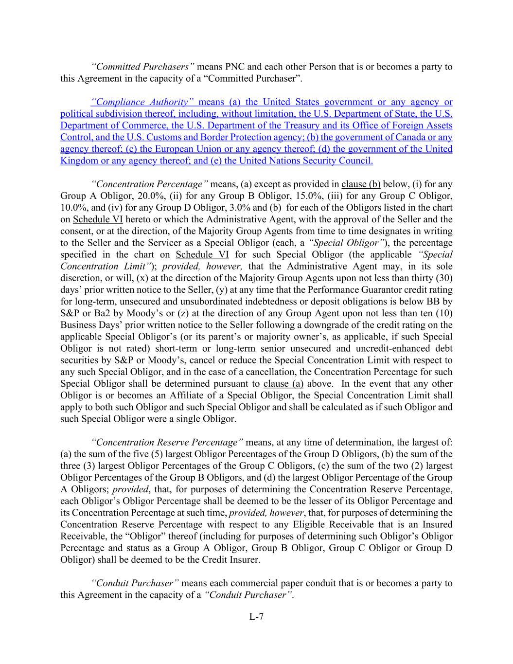 L-7 “Committed Purchasers” means PNC and each other Person that is or becomes a party to this Agreement in the capacity of a “Committed Purchaser”. “Compliance Authority” means (a) the United States government or any agency or political subdivision thereof, including, without limitation, the U.S. Department of State, the U.S. Department of Commerce, the U.S. Department of the Treasury and its Office of Foreign Assets Control, and the U.S. Customs and Border Protection agency; (b) the government of Canada or any agency thereof; (c) the European Union or any agency thereof; (d) the government of the United Kingdom or any agency thereof; and (e) the United Nations Security Council. “Concentration Percentage” means, (a) except as provided in clause (b) below, (i) for any Group A Obligor, 20.0%, (ii) for any Group B Obligor, 15.0%, (iii) for any Group C Obligor, 10.0%, and (iv) for any Group D Obligor, 3.0% and (b) for each of the Obligors listed in the chart on Schedule VI hereto or which the Administrative Agent, with the approval of the Seller and the consent, or at the direction, of the Majority Group Agents from time to time designates in writing to the Seller and the Servicer as a Special Obligor (each, a “Special Obligor”), the percentage specified in the chart on Schedule VI for such Special Obligor (the applicable “Special Concentration Limit”); provided, however, that the Administrative Agent may, in its sole discretion, or will, (x) at the direction of the Majority Group Agents upon not less than thirty (30) days’ prior written notice to the Seller, (y) at any time that the Performance Guarantor credit rating for long-term, unsecured and unsubordinated indebtedness or deposit obligations is below BB by S&P or Ba2 by Moody’s or (z) at the direction of any Group Agent upon not less than ten (10) Business Days’ prior written notice to the Seller following a downgrade of the credit rating on the applicable Special Obligor’s (or its parent’s or majority owner’s, as applicable, if such Special Obligor is not rated) short-term or long-term senior unsecured and uncredit-enhanced debt securities by S&P or Moody’s, cancel or reduce the Special Concentration Limit with respect to any such Special Obligor, and in the case of a cancellation, the Concentration Percentage for such Special Obligor shall be determined pursuant to clause (a) above. In the event that any other Obligor is or becomes an Affiliate of a Special Obligor, the Special Concentration Limit shall apply to both such Obligor and such Special Obligor and shall be calculated as if such Obligor and such Special Obligor were a single Obligor. “Concentration Reserve Percentage” means, at any time of determination, the largest of: (a) the sum of the five (5) largest Obligor Percentages of the Group D Obligors, (b) the sum of the three (3) largest Obligor Percentages of the Group C Obligors, (c) the sum of the two (2) largest Obligor Percentages of the Group B Obligors, and (d) the largest Obligor Percentage of the Group A Obligors; provided, that, for purposes of determining the Concentration Reserve Percentage, each Obligor’s Obligor Percentage shall be deemed to be the lesser of its Obligor Percentage and its Concentration Percentage at such time, provided, however, that, for purposes of determining the Concentration Reserve Percentage with respect to any Eligible Receivable that is an Insured Receivable, the “Obligor” thereof (including for purposes of determining such Obligor’s Obligor Percentage and status as a Group A Obligor, Group B Obligor, Group C Obligor or Group D Obligor) shall be deemed to be the Credit Insurer. “Conduit Purchaser” means each commercial paper conduit that is or becomes a party to this Agreement in the capacity of a “Conduit Purchaser”.