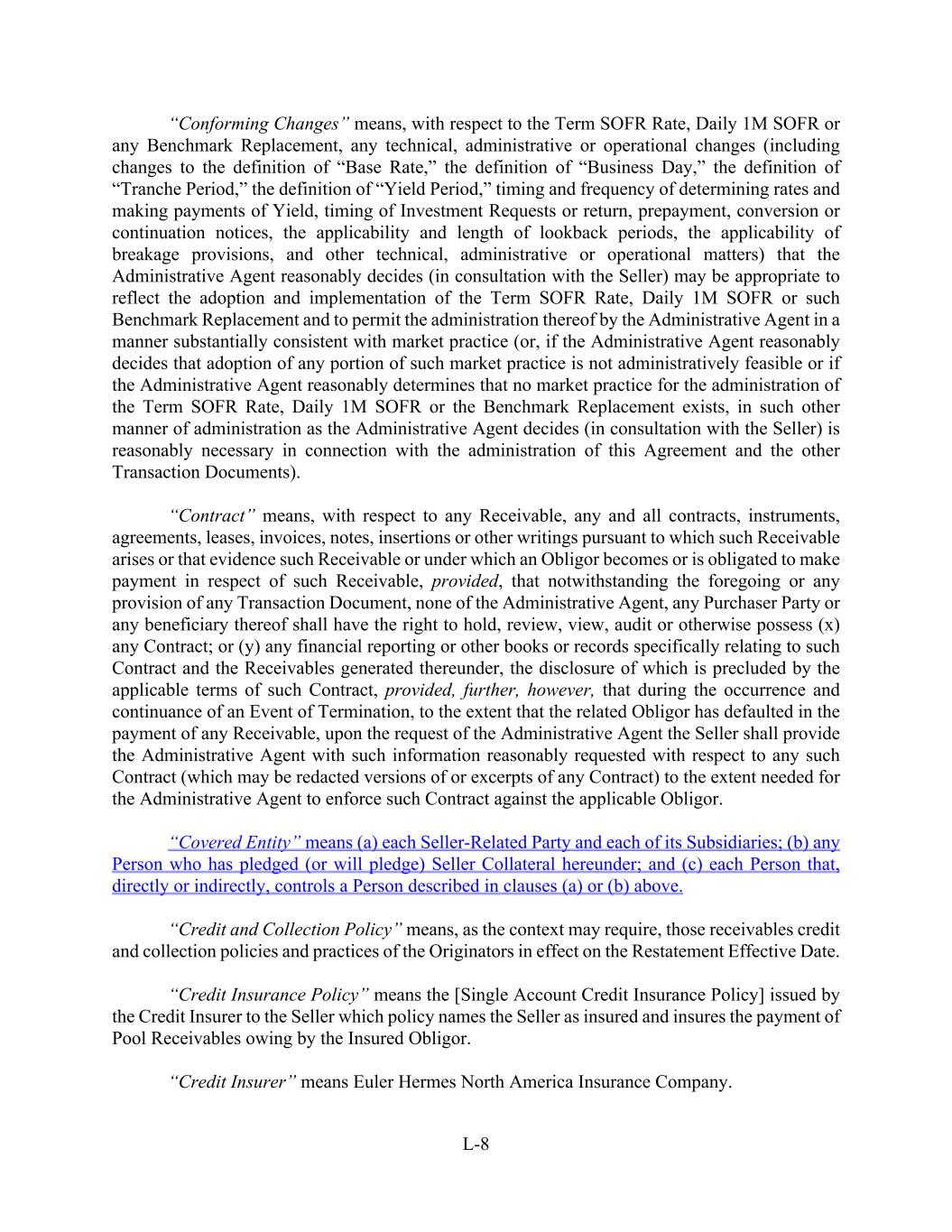L-8 “Conforming Changes” means, with respect to the Term SOFR Rate, Daily 1M SOFR or any Benchmark Replacement, any technical, administrative or operational changes (including changes to the definition of “Base Rate,” the definition of “Business Day,” the definition of “Tranche Period,” the definition of “Yield Period,” timing and frequency of determining rates and making payments of Yield, timing of Investment Requests or return, prepayment, conversion or continuation notices, the applicability and length of lookback periods, the applicability of breakage provisions, and other technical, administrative or operational matters) that the Administrative Agent reasonably decides (in consultation with the Seller) may be appropriate to reflect the adoption and implementation of the Term SOFR Rate, Daily 1M SOFR or such Benchmark Replacement and to permit the administration thereof by the Administrative Agent in a manner substantially consistent with market practice (or, if the Administrative Agent reasonably decides that adoption of any portion of such market practice is not administratively feasible or if the Administrative Agent reasonably determines that no market practice for the administration of the Term SOFR Rate, Daily 1M SOFR or the Benchmark Replacement exists, in such other manner of administration as the Administrative Agent decides (in consultation with the Seller) is reasonably necessary in connection with the administration of this Agreement and the other Transaction Documents). “Contract” means, with respect to any Receivable, any and all contracts, instruments, agreements, leases, invoices, notes, insertions or other writings pursuant to which such Receivable arises or that evidence such Receivable or under which an Obligor becomes or is obligated to make payment in respect of such Receivable, provided, that notwithstanding the foregoing or any provision of any Transaction Document, none of the Administrative Agent, any Purchaser Party or any beneficiary thereof shall have the right to hold, review, view, audit or otherwise possess (x) any Contract; or (y) any financial reporting or other books or records specifically relating to such Contract and the Receivables generated thereunder, the disclosure of which is precluded by the applicable terms of such Contract, provided, further, however, that during the occurrence and continuance of an Event of Termination, to the extent that the related Obligor has defaulted in the payment of any Receivable, upon the request of the Administrative Agent the Seller shall provide the Administrative Agent with such information reasonably requested with respect to any such Contract (which may be redacted versions of or excerpts of any Contract) to the extent needed for the Administrative Agent to enforce such Contract against the applicable Obligor. “Covered Entity” means (a) each Seller-Related Party and each of its Subsidiaries; (b) any Person who has pledged (or will pledge) Seller Collateral hereunder; and (c) each Person that, directly or indirectly, controls a Person described in clauses (a) or (b) above. “Credit and Collection Policy” means, as the context may require, those receivables credit and collection policies and practices of the Originators in effect on the Restatement Effective Date. “Credit Insurance Policy” means the [Single Account Credit Insurance Policy] issued by the Credit Insurer to the Seller which policy names the Seller as insured and insures the payment of Pool Receivables owing by the Insured Obligor. “Credit Insurer” means Euler Hermes North America Insurance Company.