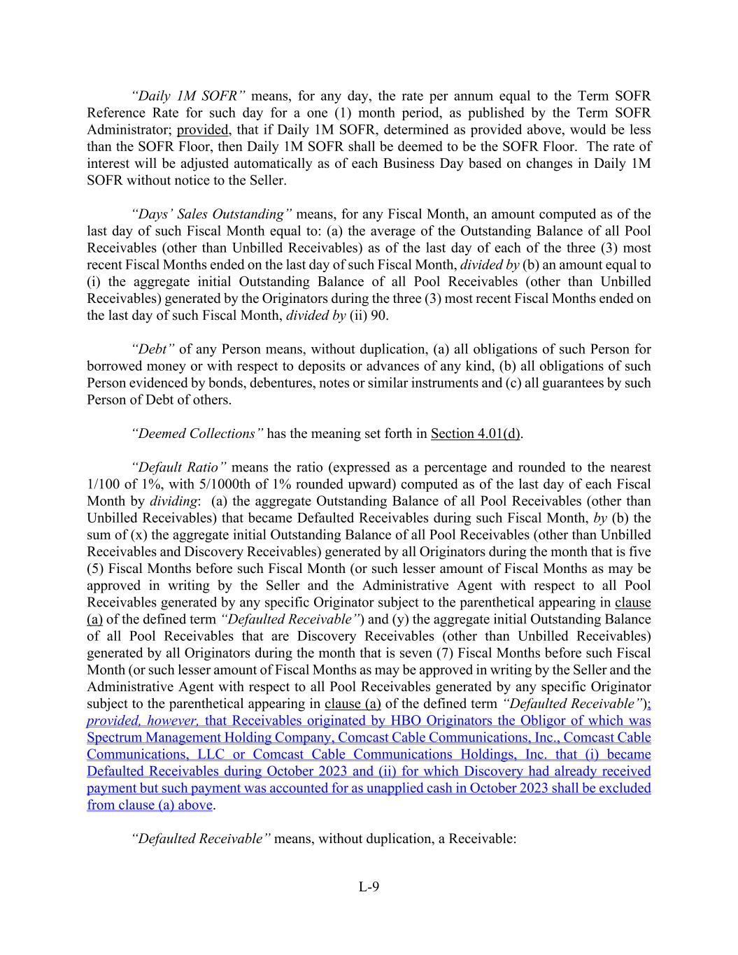 L-9 “Daily 1M SOFR” means, for any day, the rate per annum equal to the Term SOFR Reference Rate for such day for a one (1) month period, as published by the Term SOFR Administrator; provided, that if Daily 1M SOFR, determined as provided above, would be less than the SOFR Floor, then Daily 1M SOFR shall be deemed to be the SOFR Floor. The rate of interest will be adjusted automatically as of each Business Day based on changes in Daily 1M SOFR without notice to the Seller. “Days’ Sales Outstanding” means, for any Fiscal Month, an amount computed as of the last day of such Fiscal Month equal to: (a) the average of the Outstanding Balance of all Pool Receivables (other than Unbilled Receivables) as of the last day of each of the three (3) most recent Fiscal Months ended on the last day of such Fiscal Month, divided by (b) an amount equal to (i) the aggregate initial Outstanding Balance of all Pool Receivables (other than Unbilled Receivables) generated by the Originators during the three (3) most recent Fiscal Months ended on the last day of such Fiscal Month, divided by (ii) 90. “Debt” of any Person means, without duplication, (a) all obligations of such Person for borrowed money or with respect to deposits or advances of any kind, (b) all obligations of such Person evidenced by bonds, debentures, notes or similar instruments and (c) all guarantees by such Person of Debt of others. “Deemed Collections” has the meaning set forth in Section 4.01(d). “Default Ratio” means the ratio (expressed as a percentage and rounded to the nearest 1/100 of 1%, with 5/1000th of 1% rounded upward) computed as of the last day of each Fiscal Month by dividing: (a) the aggregate Outstanding Balance of all Pool Receivables (other than Unbilled Receivables) that became Defaulted Receivables during such Fiscal Month, by (b) the sum of (x) the aggregate initial Outstanding Balance of all Pool Receivables (other than Unbilled Receivables and Discovery Receivables) generated by all Originators during the month that is five (5) Fiscal Months before such Fiscal Month (or such lesser amount of Fiscal Months as may be approved in writing by the Seller and the Administrative Agent with respect to all Pool Receivables generated by any specific Originator subject to the parenthetical appearing in clause (a) of the defined term “Defaulted Receivable”) and (y) the aggregate initial Outstanding Balance of all Pool Receivables that are Discovery Receivables (other than Unbilled Receivables) generated by all Originators during the month that is seven (7) Fiscal Months before such Fiscal Month (or such lesser amount of Fiscal Months as may be approved in writing by the Seller and the Administrative Agent with respect to all Pool Receivables generated by any specific Originator subject to the parenthetical appearing in clause (a) of the defined term “Defaulted Receivable”); provided, however, that Receivables originated by HBO Originators the Obligor of which was Spectrum Management Holding Company, Comcast Cable Communications, Inc., Comcast Cable Communications, LLC or Comcast Cable Communications Holdings, Inc. that (i) became Defaulted Receivables during October 2023 and (ii) for which Discovery had already received payment but such payment was accounted for as unapplied cash in October 2023 shall be excluded from clause (a) above. “Defaulted Receivable” means, without duplication, a Receivable: