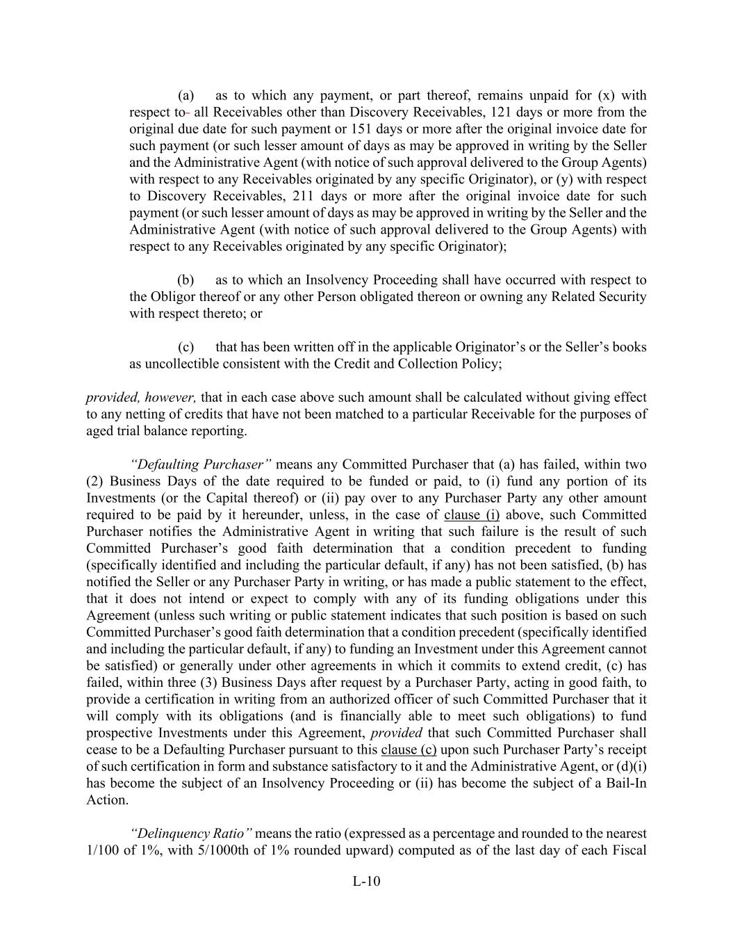 L-10 (a) as to which any payment, or part thereof, remains unpaid for (x) with respect to all Receivables other than Discovery Receivables, 121 days or more from the original due date for such payment or 151 days or more after the original invoice date for such payment (or such lesser amount of days as may be approved in writing by the Seller and the Administrative Agent (with notice of such approval delivered to the Group Agents) with respect to any Receivables originated by any specific Originator), or (y) with respect to Discovery Receivables, 211 days or more after the original invoice date for such payment (or such lesser amount of days as may be approved in writing by the Seller and the Administrative Agent (with notice of such approval delivered to the Group Agents) with respect to any Receivables originated by any specific Originator); (b) as to which an Insolvency Proceeding shall have occurred with respect to the Obligor thereof or any other Person obligated thereon or owning any Related Security with respect thereto; or (c) that has been written off in the applicable Originator’s or the Seller’s books as uncollectible consistent with the Credit and Collection Policy; provided, however, that in each case above such amount shall be calculated without giving effect to any netting of credits that have not been matched to a particular Receivable for the purposes of aged trial balance reporting. “Defaulting Purchaser” means any Committed Purchaser that (a) has failed, within two (2) Business Days of the date required to be funded or paid, to (i) fund any portion of its Investments (or the Capital thereof) or (ii) pay over to any Purchaser Party any other amount required to be paid by it hereunder, unless, in the case of clause (i) above, such Committed Purchaser notifies the Administrative Agent in writing that such failure is the result of such Committed Purchaser’s good faith determination that a condition precedent to funding (specifically identified and including the particular default, if any) has not been satisfied, (b) has notified the Seller or any Purchaser Party in writing, or has made a public statement to the effect, that it does not intend or expect to comply with any of its funding obligations under this Agreement (unless such writing or public statement indicates that such position is based on such Committed Purchaser’s good faith determination that a condition precedent (specifically identified and including the particular default, if any) to funding an Investment under this Agreement cannot be satisfied) or generally under other agreements in which it commits to extend credit, (c) has failed, within three (3) Business Days after request by a Purchaser Party, acting in good faith, to provide a certification in writing from an authorized officer of such Committed Purchaser that it will comply with its obligations (and is financially able to meet such obligations) to fund prospective Investments under this Agreement, provided that such Committed Purchaser shall cease to be a Defaulting Purchaser pursuant to this clause (c) upon such Purchaser Party’s receipt of such certification in form and substance satisfactory to it and the Administrative Agent, or (d)(i) has become the subject of an Insolvency Proceeding or (ii) has become the subject of a Bail-In Action. “Delinquency Ratio” means the ratio (expressed as a percentage and rounded to the nearest 1/100 of 1%, with 5/1000th of 1% rounded upward) computed as of the last day of each Fiscal