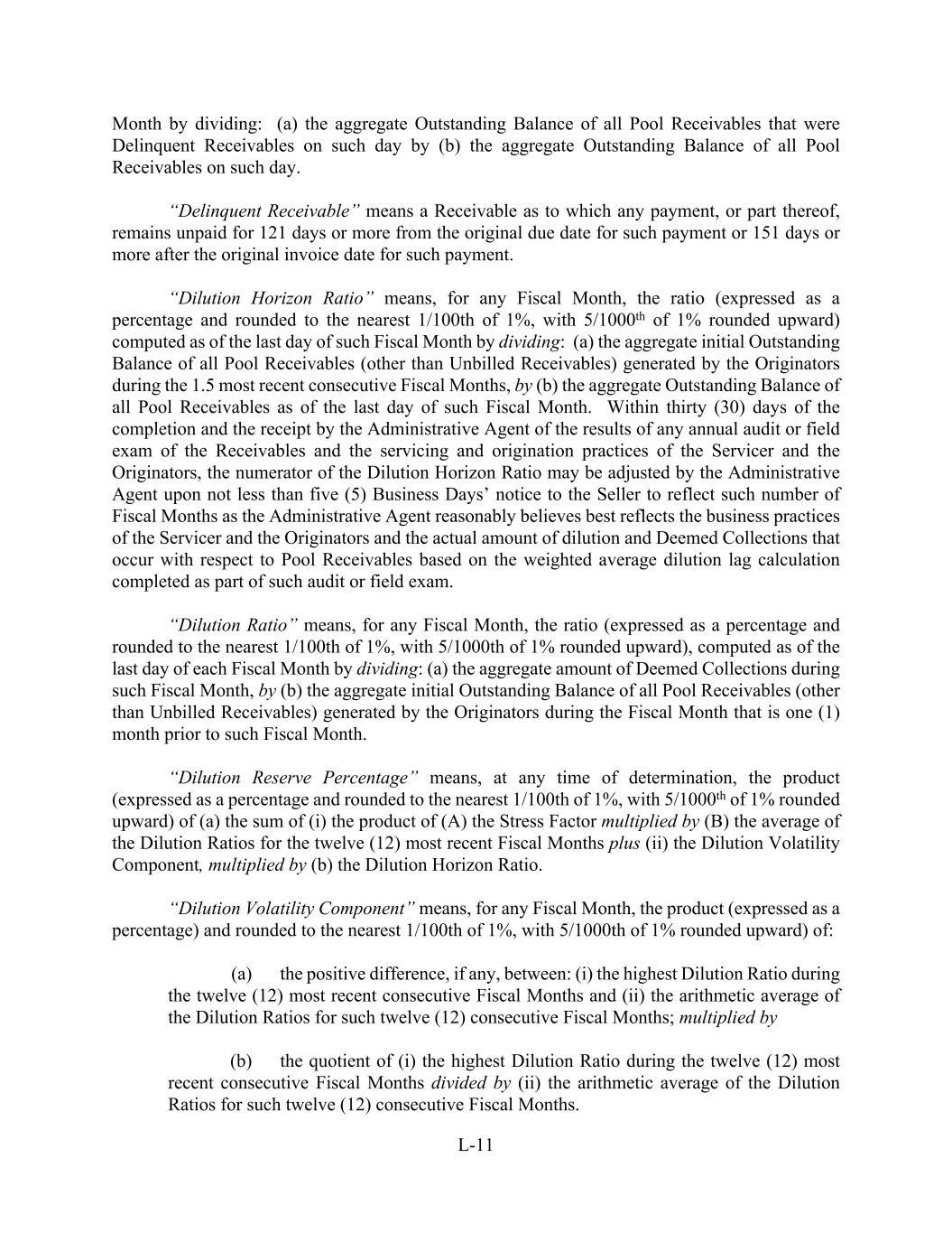 L-11 Month by dividing: (a) the aggregate Outstanding Balance of all Pool Receivables that were Delinquent Receivables on such day by (b) the aggregate Outstanding Balance of all Pool Receivables on such day. “Delinquent Receivable” means a Receivable as to which any payment, or part thereof, remains unpaid for 121 days or more from the original due date for such payment or 151 days or more after the original invoice date for such payment. “Dilution Horizon Ratio” means, for any Fiscal Month, the ratio (expressed as a percentage and rounded to the nearest 1/100th of 1%, with 5/1000th of 1% rounded upward) computed as of the last day of such Fiscal Month by dividing: (a) the aggregate initial Outstanding Balance of all Pool Receivables (other than Unbilled Receivables) generated by the Originators during the 1.5 most recent consecutive Fiscal Months, by (b) the aggregate Outstanding Balance of all Pool Receivables as of the last day of such Fiscal Month. Within thirty (30) days of the completion and the receipt by the Administrative Agent of the results of any annual audit or field exam of the Receivables and the servicing and origination practices of the Servicer and the Originators, the numerator of the Dilution Horizon Ratio may be adjusted by the Administrative Agent upon not less than five (5) Business Days’ notice to the Seller to reflect such number of Fiscal Months as the Administrative Agent reasonably believes best reflects the business practices of the Servicer and the Originators and the actual amount of dilution and Deemed Collections that occur with respect to Pool Receivables based on the weighted average dilution lag calculation completed as part of such audit or field exam. “Dilution Ratio” means, for any Fiscal Month, the ratio (expressed as a percentage and rounded to the nearest 1/100th of 1%, with 5/1000th of 1% rounded upward), computed as of the last day of each Fiscal Month by dividing: (a) the aggregate amount of Deemed Collections during such Fiscal Month, by (b) the aggregate initial Outstanding Balance of all Pool Receivables (other than Unbilled Receivables) generated by the Originators during the Fiscal Month that is one (1) month prior to such Fiscal Month. “Dilution Reserve Percentage” means, at any time of determination, the product (expressed as a percentage and rounded to the nearest 1/100th of 1%, with 5/1000th of 1% rounded upward) of (a) the sum of (i) the product of (A) the Stress Factor multiplied by (B) the average of the Dilution Ratios for the twelve (12) most recent Fiscal Months plus (ii) the Dilution Volatility Component, multiplied by (b) the Dilution Horizon Ratio. “Dilution Volatility Component” means, for any Fiscal Month, the product (expressed as a percentage) and rounded to the nearest 1/100th of 1%, with 5/1000th of 1% rounded upward) of: (a) the positive difference, if any, between: (i) the highest Dilution Ratio during the twelve (12) most recent consecutive Fiscal Months and (ii) the arithmetic average of the Dilution Ratios for such twelve (12) consecutive Fiscal Months; multiplied by (b) the quotient of (i) the highest Dilution Ratio during the twelve (12) most recent consecutive Fiscal Months divided by (ii) the arithmetic average of the Dilution Ratios for such twelve (12) consecutive Fiscal Months.
