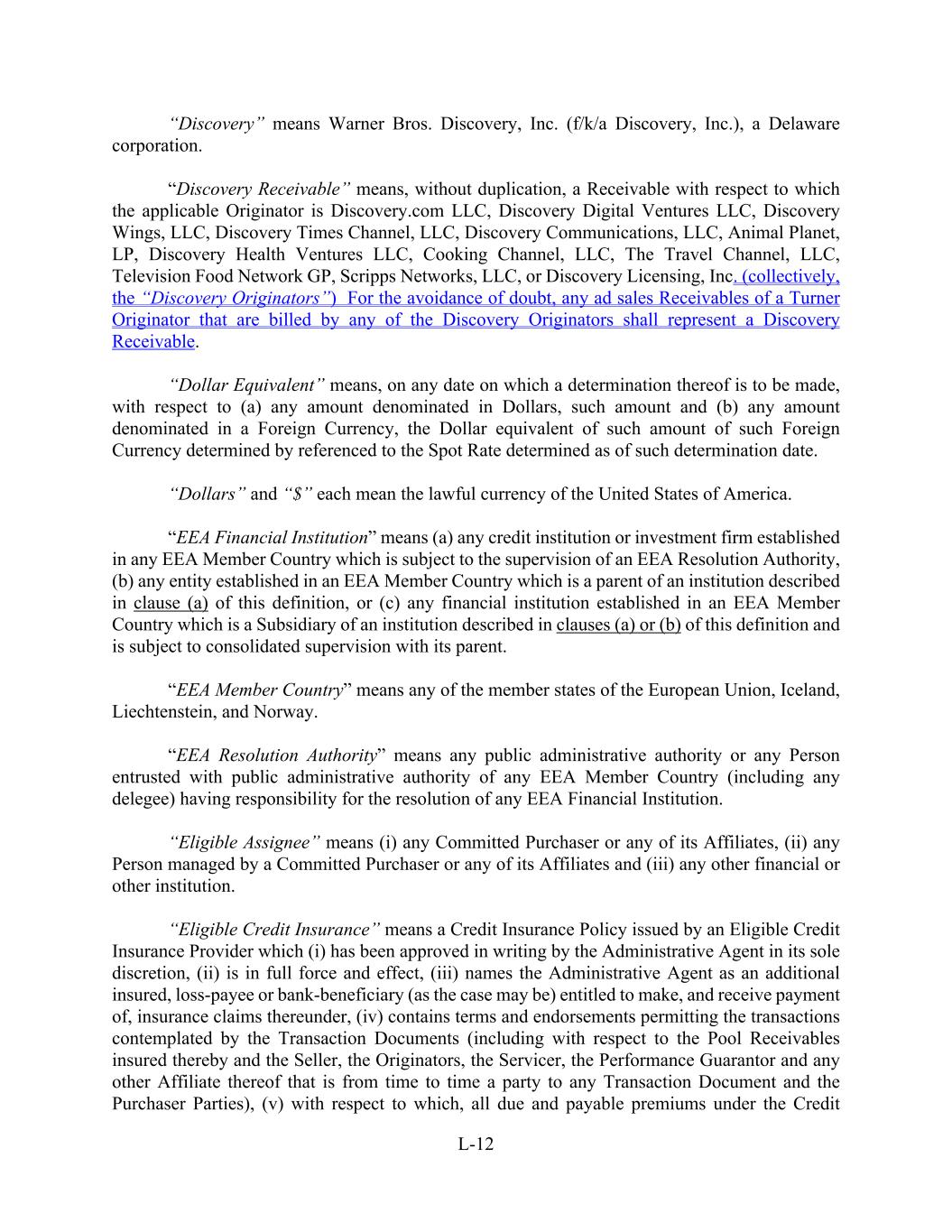L-12 “Discovery” means Warner Bros. Discovery, Inc. (f/k/a Discovery, Inc.), a Delaware corporation. “Discovery Receivable” means, without duplication, a Receivable with respect to which the applicable Originator is Discovery.com LLC, Discovery Digital Ventures LLC, Discovery Wings, LLC, Discovery Times Channel, LLC, Discovery Communications, LLC, Animal Planet, LP, Discovery Health Ventures LLC, Cooking Channel, LLC, The Travel Channel, LLC, Television Food Network GP, Scripps Networks, LLC, or Discovery Licensing, Inc. (collectively, the “Discovery Originators”) For the avoidance of doubt, any ad sales Receivables of a Turner Originator that are billed by any of the Discovery Originators shall represent a Discovery Receivable. “Dollar Equivalent” means, on any date on which a determination thereof is to be made, with respect to (a) any amount denominated in Dollars, such amount and (b) any amount denominated in a Foreign Currency, the Dollar equivalent of such amount of such Foreign Currency determined by referenced to the Spot Rate determined as of such determination date. “Dollars” and “$” each mean the lawful currency of the United States of America. “EEA Financial Institution” means (a) any credit institution or investment firm established in any EEA Member Country which is subject to the supervision of an EEA Resolution Authority, (b) any entity established in an EEA Member Country which is a parent of an institution described in clause (a) of this definition, or (c) any financial institution established in an EEA Member Country which is a Subsidiary of an institution described in clauses (a) or (b) of this definition and is subject to consolidated supervision with its parent. “EEA Member Country” means any of the member states of the European Union, Iceland, Liechtenstein, and Norway. “EEA Resolution Authority” means any public administrative authority or any Person entrusted with public administrative authority of any EEA Member Country (including any delegee) having responsibility for the resolution of any EEA Financial Institution. “Eligible Assignee” means (i) any Committed Purchaser or any of its Affiliates, (ii) any Person managed by a Committed Purchaser or any of its Affiliates and (iii) any other financial or other institution. “Eligible Credit Insurance” means a Credit Insurance Policy issued by an Eligible Credit Insurance Provider which (i) has been approved in writing by the Administrative Agent in its sole discretion, (ii) is in full force and effect, (iii) names the Administrative Agent as an additional insured, loss-payee or bank-beneficiary (as the case may be) entitled to make, and receive payment of, insurance claims thereunder, (iv) contains terms and endorsements permitting the transactions contemplated by the Transaction Documents (including with respect to the Pool Receivables insured thereby and the Seller, the Originators, the Servicer, the Performance Guarantor and any other Affiliate thereof that is from time to time a party to any Transaction Document and the Purchaser Parties), (v) with respect to which, all due and payable premiums under the Credit