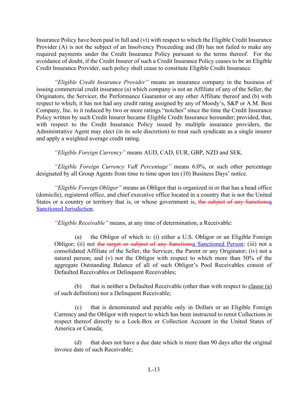 L-13 Insurance Policy have been paid in full and (vi) with respect to which the Eligible Credit Insurance Provider (A) is not the subject of an Insolvency Proceeding and (B) has not failed to make any required payments under the Credit Insurance Policy pursuant to the terms thereof. For the avoidance of doubt, if the Credit Insurer of such a Credit Insurance Policy ceases to be an Eligible Credit Insurance Provider, such policy shall cease to constitute Eligible Credit Insurance. “Eligible Credit Insurance Provider” means an insurance company in the business of issuing commercial credit insurance (a) which company is not an Affiliate of any of the Seller, the Originators, the Servicer, the Performance Guarantor or any other Affiliate thereof and (b) with respect to which, it has not had any credit rating assigned by any of Moody’s, S&P or A.M. Best Company, Inc. to it reduced by two or more ratings “notches” since the time the Credit Insurance Policy written by such Credit Insurer became Eligible Credit Insurance hereunder; provided, that, with respect to the Credit Insurance Policy issued by multiple insurance providers, the Administrative Agent may elect (in its sole discretion) to treat such syndicate as a single insurer and apply a weighted average credit rating. “Eligible Foreign Currency” means AUD, CAD, EUR, GBP, NZD and SEK. “Eligible Foreign Currency VaR Percentage” means 6.0%, or such other percentage designated by all Group Agents from time to time upon ten (10) Business Days’ notice. “Eligible Foreign Obligor” means an Obligor that is organized in or that has a head office (domicile), registered office, and chief executive office located in a country that is not the United States or a country or territory that is, or whose government is, the subject of any Sanctionsa Sanctioned Jurisdiction. “Eligible Receivable” means, at any time of determination, a Receivable: (a) the Obligor of which is: (i) either a U.S. Obligor or an Eligible Foreign Obligor; (ii) not the target or subject of any Sanctionsa Sanctioned Person; (iii) not a consolidated Affiliate of the Seller, the Servicer, the Parent or any Originator; (iv) not a natural person; and (v) not the Obligor with respect to which more than 50% of the aggregate Outstanding Balance of all of such Obligor’s Pool Receivables consist of Defaulted Receivables or Delinquent Receivables; (b) that is neither a Defaulted Receivable (other than with respect to clause (a) of such definition) nor a Delinquent Receivable; (c) that is denominated and payable only in Dollars or an Eligible Foreign Currency and the Obligor with respect to which has been instructed to remit Collections in respect thereof directly to a Lock-Box or Collection Account in the United States of America or Canada; (d) that does not have a due date which is more than 90 days after the original invoice date of such Receivable;