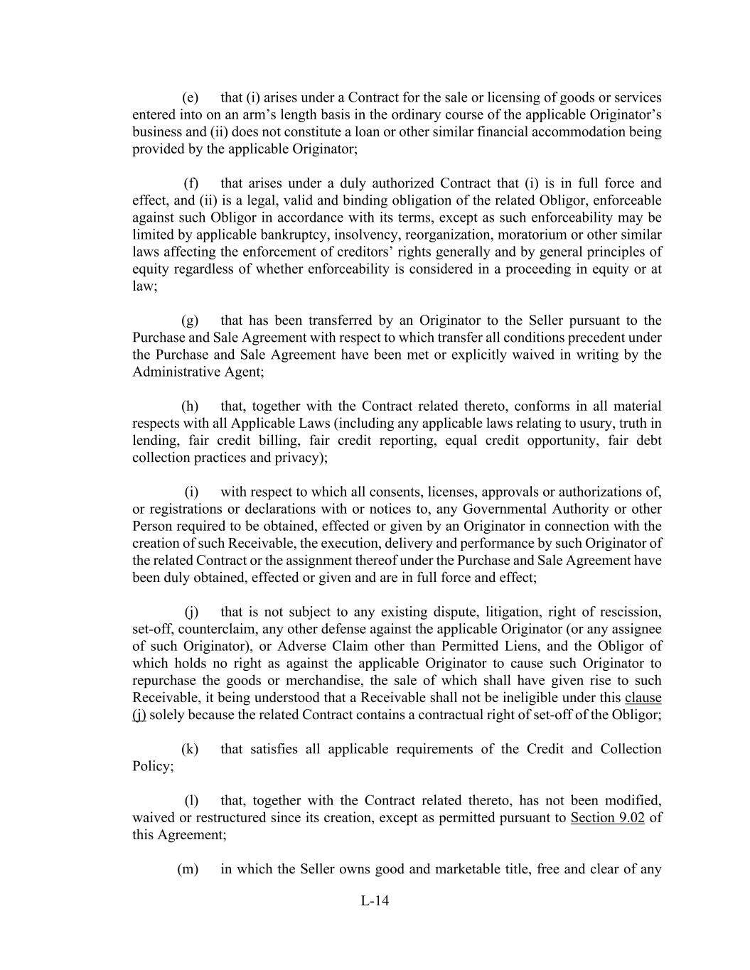 L-14 (e) that (i) arises under a Contract for the sale or licensing of goods or services entered into on an arm’s length basis in the ordinary course of the applicable Originator’s business and (ii) does not constitute a loan or other similar financial accommodation being provided by the applicable Originator; (f) that arises under a duly authorized Contract that (i) is in full force and effect, and (ii) is a legal, valid and binding obligation of the related Obligor, enforceable against such Obligor in accordance with its terms, except as such enforceability may be limited by applicable bankruptcy, insolvency, reorganization, moratorium or other similar laws affecting the enforcement of creditors’ rights generally and by general principles of equity regardless of whether enforceability is considered in a proceeding in equity or at law; (g) that has been transferred by an Originator to the Seller pursuant to the Purchase and Sale Agreement with respect to which transfer all conditions precedent under the Purchase and Sale Agreement have been met or explicitly waived in writing by the Administrative Agent; (h) that, together with the Contract related thereto, conforms in all material respects with all Applicable Laws (including any applicable laws relating to usury, truth in lending, fair credit billing, fair credit reporting, equal credit opportunity, fair debt collection practices and privacy); (i) with respect to which all consents, licenses, approvals or authorizations of, or registrations or declarations with or notices to, any Governmental Authority or other Person required to be obtained, effected or given by an Originator in connection with the creation of such Receivable, the execution, delivery and performance by such Originator of the related Contract or the assignment thereof under the Purchase and Sale Agreement have been duly obtained, effected or given and are in full force and effect; (j) that is not subject to any existing dispute, litigation, right of rescission, set-off, counterclaim, any other defense against the applicable Originator (or any assignee of such Originator), or Adverse Claim other than Permitted Liens, and the Obligor of which holds no right as against the applicable Originator to cause such Originator to repurchase the goods or merchandise, the sale of which shall have given rise to such Receivable, it being understood that a Receivable shall not be ineligible under this clause (j) solely because the related Contract contains a contractual right of set-off of the Obligor; (k) that satisfies all applicable requirements of the Credit and Collection Policy; (l) that, together with the Contract related thereto, has not been modified, waived or restructured since its creation, except as permitted pursuant to Section 9.02 of this Agreement; (m) in which the Seller owns good and marketable title, free and clear of any