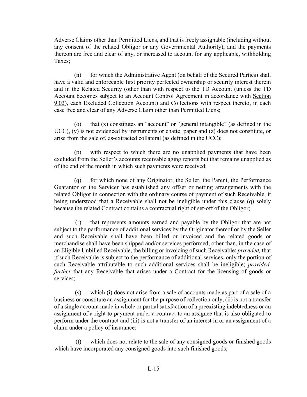 L-15 Adverse Claims other than Permitted Liens, and that is freely assignable (including without any consent of the related Obligor or any Governmental Authority), and the payments thereon are free and clear of any, or increased to account for any applicable, withholding Taxes; (n) for which the Administrative Agent (on behalf of the Secured Parties) shall have a valid and enforceable first priority perfected ownership or security interest therein and in the Related Security (other than with respect to the TD Account (unless the TD Account becomes subject to an Account Control Agreement in accordance with Section 9.03), each Excluded Collection Account) and Collections with respect thereto, in each case free and clear of any Adverse Claim other than Permitted Liens; (o) that (x) constitutes an “account” or “general intangible” (as defined in the UCC), (y) is not evidenced by instruments or chattel paper and (z) does not constitute, or arise from the sale of, as-extracted collateral (as defined in the UCC); (p) with respect to which there are no unapplied payments that have been excluded from the Seller’s accounts receivable aging reports but that remains unapplied as of the end of the month in which such payments were received; (q) for which none of any Originator, the Seller, the Parent, the Performance Guarantor or the Servicer has established any offset or netting arrangements with the related Obligor in connection with the ordinary course of payment of such Receivable, it being understood that a Receivable shall not be ineligible under this clause (q) solely because the related Contract contains a contractual right of set-off of the Obligor; (r) that represents amounts earned and payable by the Obligor that are not subject to the performance of additional services by the Originator thereof or by the Seller and such Receivable shall have been billed or invoiced and the related goods or merchandise shall have been shipped and/or services performed, other than, in the case of an Eligible Unbilled Receivable, the billing or invoicing of such Receivable; provided, that if such Receivable is subject to the performance of additional services, only the portion of such Receivable attributable to such additional services shall be ineligible; provided, further that any Receivable that arises under a Contract for the licensing of goods or services; (s) which (i) does not arise from a sale of accounts made as part of a sale of a business or constitute an assignment for the purpose of collection only, (ii) is not a transfer of a single account made in whole or partial satisfaction of a preexisting indebtedness or an assignment of a right to payment under a contract to an assignee that is also obligated to perform under the contract and (iii) is not a transfer of an interest in or an assignment of a claim under a policy of insurance; (t) which does not relate to the sale of any consigned goods or finished goods which have incorporated any consigned goods into such finished goods;