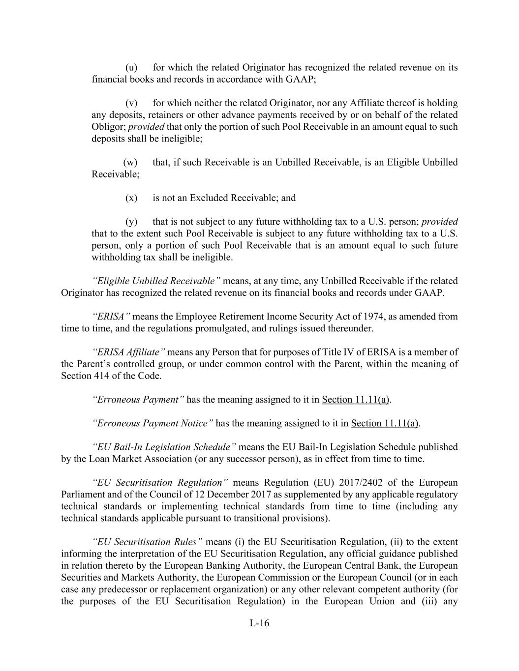 L-16 (u) for which the related Originator has recognized the related revenue on its financial books and records in accordance with GAAP; (v) for which neither the related Originator, nor any Affiliate thereof is holding any deposits, retainers or other advance payments received by or on behalf of the related Obligor; provided that only the portion of such Pool Receivable in an amount equal to such deposits shall be ineligible; (w) that, if such Receivable is an Unbilled Receivable, is an Eligible Unbilled Receivable; (x) is not an Excluded Receivable; and (y) that is not subject to any future withholding tax to a U.S. person; provided that to the extent such Pool Receivable is subject to any future withholding tax to a U.S. person, only a portion of such Pool Receivable that is an amount equal to such future withholding tax shall be ineligible. “Eligible Unbilled Receivable” means, at any time, any Unbilled Receivable if the related Originator has recognized the related revenue on its financial books and records under GAAP. “ERISA” means the Employee Retirement Income Security Act of 1974, as amended from time to time, and the regulations promulgated, and rulings issued thereunder. “ERISA Affiliate” means any Person that for purposes of Title IV of ERISA is a member of the Parent’s controlled group, or under common control with the Parent, within the meaning of Section 414 of the Code. “Erroneous Payment” has the meaning assigned to it in Section 11.11(a). “Erroneous Payment Notice” has the meaning assigned to it in Section 11.11(a). “EU Bail-In Legislation Schedule” means the EU Bail-In Legislation Schedule published by the Loan Market Association (or any successor person), as in effect from time to time. “EU Securitisation Regulation” means Regulation (EU) 2017/2402 of the European Parliament and of the Council of 12 December 2017 as supplemented by any applicable regulatory technical standards or implementing technical standards from time to time (including any technical standards applicable pursuant to transitional provisions). “EU Securitisation Rules” means (i) the EU Securitisation Regulation, (ii) to the extent informing the interpretation of the EU Securitisation Regulation, any official guidance published in relation thereto by the European Banking Authority, the European Central Bank, the European Securities and Markets Authority, the European Commission or the European Council (or in each case any predecessor or replacement organization) or any other relevant competent authority (for the purposes of the EU Securitisation Regulation) in the European Union and (iii) any