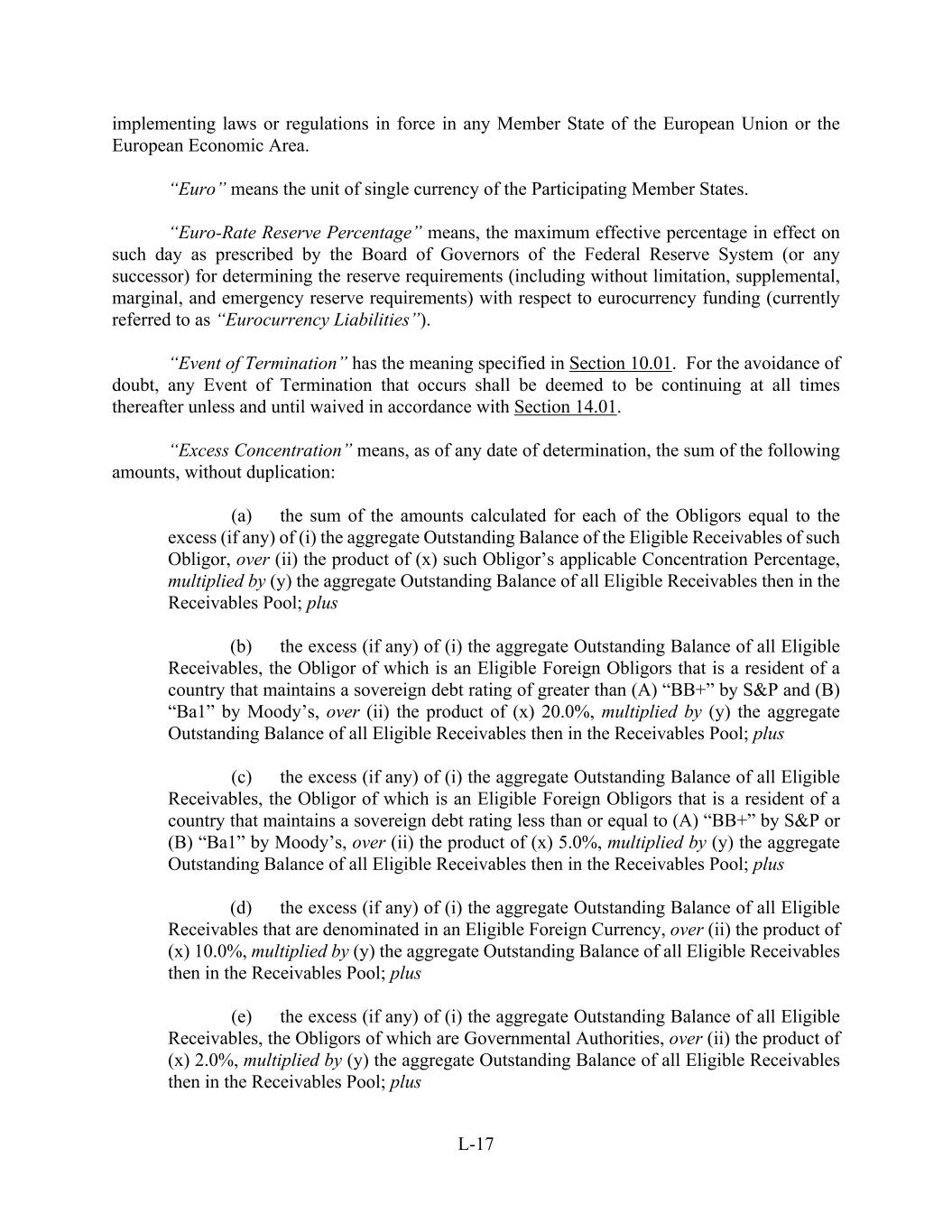 L-17 implementing laws or regulations in force in any Member State of the European Union or the European Economic Area. “Euro” means the unit of single currency of the Participating Member States. “Euro-Rate Reserve Percentage” means, the maximum effective percentage in effect on such day as prescribed by the Board of Governors of the Federal Reserve System (or any successor) for determining the reserve requirements (including without limitation, supplemental, marginal, and emergency reserve requirements) with respect to eurocurrency funding (currently referred to as “Eurocurrency Liabilities”). “Event of Termination” has the meaning specified in Section 10.01. For the avoidance of doubt, any Event of Termination that occurs shall be deemed to be continuing at all times thereafter unless and until waived in accordance with Section 14.01. “Excess Concentration” means, as of any date of determination, the sum of the following amounts, without duplication: (a) the sum of the amounts calculated for each of the Obligors equal to the excess (if any) of (i) the aggregate Outstanding Balance of the Eligible Receivables of such Obligor, over (ii) the product of (x) such Obligor’s applicable Concentration Percentage, multiplied by (y) the aggregate Outstanding Balance of all Eligible Receivables then in the Receivables Pool; plus (b) the excess (if any) of (i) the aggregate Outstanding Balance of all Eligible Receivables, the Obligor of which is an Eligible Foreign Obligors that is a resident of a country that maintains a sovereign debt rating of greater than (A) “BB+” by S&P and (B) “Ba1” by Moody’s, over (ii) the product of (x) 20.0%, multiplied by (y) the aggregate Outstanding Balance of all Eligible Receivables then in the Receivables Pool; plus (c) the excess (if any) of (i) the aggregate Outstanding Balance of all Eligible Receivables, the Obligor of which is an Eligible Foreign Obligors that is a resident of a country that maintains a sovereign debt rating less than or equal to (A) “BB+” by S&P or (B) “Ba1” by Moody’s, over (ii) the product of (x) 5.0%, multiplied by (y) the aggregate Outstanding Balance of all Eligible Receivables then in the Receivables Pool; plus (d) the excess (if any) of (i) the aggregate Outstanding Balance of all Eligible Receivables that are denominated in an Eligible Foreign Currency, over (ii) the product of (x) 10.0%, multiplied by (y) the aggregate Outstanding Balance of all Eligible Receivables then in the Receivables Pool; plus (e) the excess (if any) of (i) the aggregate Outstanding Balance of all Eligible Receivables, the Obligors of which are Governmental Authorities, over (ii) the product of (x) 2.0%, multiplied by (y) the aggregate Outstanding Balance of all Eligible Receivables then in the Receivables Pool; plus