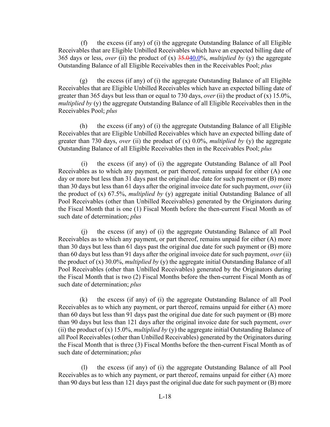 L-18 (f) the excess (if any) of (i) the aggregate Outstanding Balance of all Eligible Receivables that are Eligible Unbilled Receivables which have an expected billing date of 365 days or less, over (ii) the product of (x) 35.040.0%, multiplied by (y) the aggregate Outstanding Balance of all Eligible Receivables then in the Receivables Pool; plus (g) the excess (if any) of (i) the aggregate Outstanding Balance of all Eligible Receivables that are Eligible Unbilled Receivables which have an expected billing date of greater than 365 days but less than or equal to 730 days, over (ii) the product of (x) 15.0%, multiplied by (y) the aggregate Outstanding Balance of all Eligible Receivables then in the Receivables Pool; plus (h) the excess (if any) of (i) the aggregate Outstanding Balance of all Eligible Receivables that are Eligible Unbilled Receivables which have an expected billing date of greater than 730 days, over (ii) the product of (x) 0.0%, multiplied by (y) the aggregate Outstanding Balance of all Eligible Receivables then in the Receivables Pool; plus (i) the excess (if any) of (i) the aggregate Outstanding Balance of all Pool Receivables as to which any payment, or part thereof, remains unpaid for either (A) one day or more but less than 31 days past the original due date for such payment or (B) more than 30 days but less than 61 days after the original invoice date for such payment, over (ii) the product of (x) 67.5%, multiplied by (y) aggregate initial Outstanding Balance of all Pool Receivables (other than Unbilled Receivables) generated by the Originators during the Fiscal Month that is one (1) Fiscal Month before the then-current Fiscal Month as of such date of determination; plus (j) the excess (if any) of (i) the aggregate Outstanding Balance of all Pool Receivables as to which any payment, or part thereof, remains unpaid for either (A) more than 30 days but less than 61 days past the original due date for such payment or (B) more than 60 days but less than 91 days after the original invoice date for such payment, over (ii) the product of (x) 30.0%, multiplied by (y) the aggregate initial Outstanding Balance of all Pool Receivables (other than Unbilled Receivables) generated by the Originators during the Fiscal Month that is two (2) Fiscal Months before the then-current Fiscal Month as of such date of determination; plus (k) the excess (if any) of (i) the aggregate Outstanding Balance of all Pool Receivables as to which any payment, or part thereof, remains unpaid for either (A) more than 60 days but less than 91 days past the original due date for such payment or (B) more than 90 days but less than 121 days after the original invoice date for such payment, over (ii) the product of (x) 15.0%, multiplied by (y) the aggregate initial Outstanding Balance of all Pool Receivables (other than Unbilled Receivables) generated by the Originators during the Fiscal Month that is three (3) Fiscal Months before the then-current Fiscal Month as of such date of determination; plus (l) the excess (if any) of (i) the aggregate Outstanding Balance of all Pool Receivables as to which any payment, or part thereof, remains unpaid for either (A) more than 90 days but less than 121 days past the original due date for such payment or (B) more