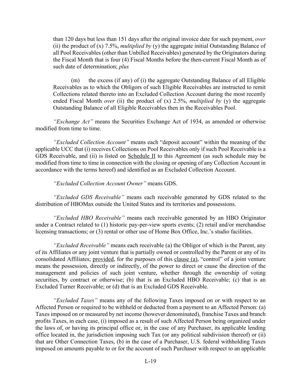 L-19 than 120 days but less than 151 days after the original invoice date for such payment, over (ii) the product of (x) 7.5%, multiplied by (y) the aggregate initial Outstanding Balance of all Pool Receivables (other than Unbilled Receivables) generated by the Originators during the Fiscal Month that is four (4) Fiscal Months before the then-current Fiscal Month as of such date of determination; plus (m) the excess (if any) of (i) the aggregate Outstanding Balance of all Eligible Receivables as to which the Obligors of such Eligible Receivables are instructed to remit Collections related thereto into an Excluded Collection Account during the most recently ended Fiscal Month over (ii) the product of (x) 2.5%, multiplied by (y) the aggregate Outstanding Balance of all Eligible Receivables then in the Receivables Pool. “Exchange Act” means the Securities Exchange Act of 1934, as amended or otherwise modified from time to time. “Excluded Collection Account” means each “deposit account” within the meaning of the applicable UCC that (i) receives Collections on Pool Receivables only if such Pool Receivable is a GDS Receivable, and (ii) is listed on Schedule II to this Agreement (as such schedule may be modified from time to time in connection with the closing or opening of any Collection Account in accordance with the terms hereof) and identified as an Excluded Collection Account. “Excluded Collection Account Owner” means GDS. “Excluded GDS Receivable” means each receivable generated by GDS related to the distribution of HBOMax outside the United States and its territories and possessions. “Excluded HBO Receivable” means each receivable generated by an HBO Originator under a Contract related to (1) historic pay-per-view sports events; (2) retail and/or merchandise licensing transactions; or (3) rental or other use of Home Box Office, Inc.’s studio facilities. “Excluded Receivable” means each receivable (a) the Obligor of which is the Parent, any of its Affiliates or any joint venture that is partially owned or controlled by the Parent or any of its consolidated Affiliates; provided, for the purposes of this clause (a), “control” of a joint venture means the possession, directly or indirectly, of the power to direct or cause the direction of the management and policies of such joint venture, whether through the ownership of voting securities, by contract or otherwise; (b) that is an Excluded HBO Receivable; (c) that is an Excluded Turner Receivable; or (d) that is an Excluded GDS Receivable. “Excluded Taxes” means any of the following Taxes imposed on or with respect to an Affected Person or required to be withheld or deducted from a payment to an Affected Person: (a) Taxes imposed on or measured by net income (however denominated), franchise Taxes and branch profits Taxes, in each case, (i) imposed as a result of such Affected Person being organized under the laws of, or having its principal office or, in the case of any Purchaser, its applicable lending office located in, the jurisdiction imposing such Tax (or any political subdivision thereof) or (ii) that are Other Connection Taxes, (b) in the case of a Purchaser, U.S. federal withholding Taxes imposed on amounts payable to or for the account of such Purchaser with respect to an applicable