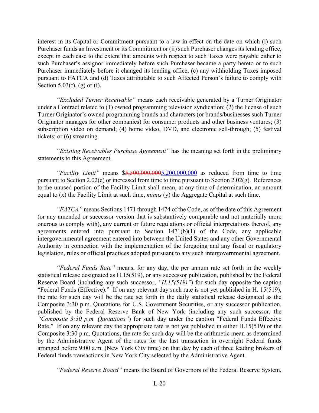 L-20 interest in its Capital or Commitment pursuant to a law in effect on the date on which (i) such Purchaser funds an Investment or its Commitment or (ii) such Purchaser changes its lending office, except in each case to the extent that amounts with respect to such Taxes were payable either to such Purchaser’s assignor immediately before such Purchaser became a party hereto or to such Purchaser immediately before it changed its lending office, (c) any withholding Taxes imposed pursuant to FATCA and (d) Taxes attributable to such Affected Person’s failure to comply with Section 5.03(f), (g) or (i). “Excluded Turner Receivable” means each receivable generated by a Turner Originator under a Contract related to (1) owned programming television syndication; (2) the license of such Turner Originator’s owned programming brands and characters (or brands/businesses such Turner Originator manages for other companies) for consumer products and other business ventures; (3) subscription video on demand; (4) home video, DVD, and electronic sell-through; (5) festival tickets; or (6) streaming. “Existing Receivables Purchase Agreement” has the meaning set forth in the preliminary statements to this Agreement. “Facility Limit” means $5,500,000,0005,200,000,000 as reduced from time to time pursuant to Section 2.02(e) or increased from time to time pursuant to Section 2.02(g). References to the unused portion of the Facility Limit shall mean, at any time of determination, an amount equal to (x) the Facility Limit at such time, minus (y) the Aggregate Capital at such time. “FATCA” means Sections 1471 through 1474 of the Code, as of the date of this Agreement (or any amended or successor version that is substantively comparable and not materially more onerous to comply with), any current or future regulations or official interpretations thereof, any agreements entered into pursuant to Section 1471(b)(1) of the Code, any applicable intergovernmental agreement entered into between the United States and any other Governmental Authority in connection with the implementation of the foregoing and any fiscal or regulatory legislation, rules or official practices adopted pursuant to any such intergovernmental agreement. “Federal Funds Rate” means, for any day, the per annum rate set forth in the weekly statistical release designated as H.15(519), or any successor publication, published by the Federal Reserve Board (including any such successor, “H.15(519)”) for such day opposite the caption “Federal Funds (Effective).” If on any relevant day such rate is not yet published in H. 15(519), the rate for such day will be the rate set forth in the daily statistical release designated as the Composite 3:30 p.m. Quotations for U.S. Government Securities, or any successor publication, published by the Federal Reserve Bank of New York (including any such successor, the “Composite 3:30 p.m. Quotations”) for such day under the caption “Federal Funds Effective Rate.” If on any relevant day the appropriate rate is not yet published in either H.15(519) or the Composite 3:30 p.m. Quotations, the rate for such day will be the arithmetic mean as determined by the Administrative Agent of the rates for the last transaction in overnight Federal funds arranged before 9:00 a.m. (New York City time) on that day by each of three leading brokers of Federal funds transactions in New York City selected by the Administrative Agent. “Federal Reserve Board” means the Board of Governors of the Federal Reserve System,