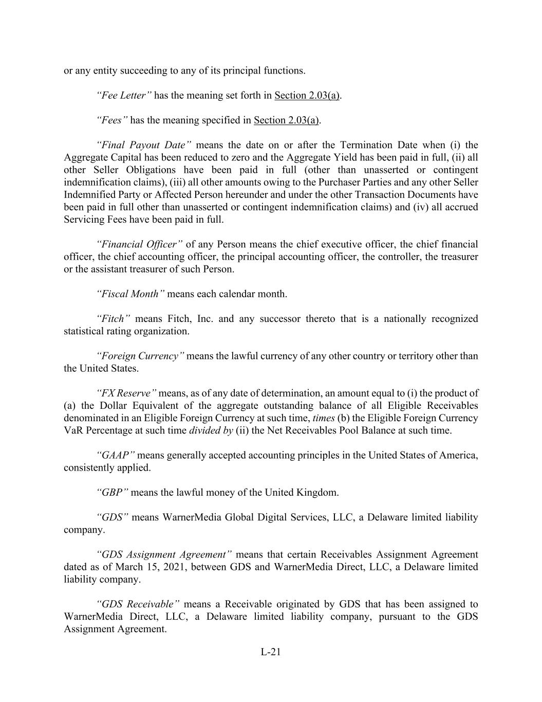 L-21 or any entity succeeding to any of its principal functions. “Fee Letter” has the meaning set forth in Section 2.03(a). “Fees” has the meaning specified in Section 2.03(a). “Final Payout Date” means the date on or after the Termination Date when (i) the Aggregate Capital has been reduced to zero and the Aggregate Yield has been paid in full, (ii) all other Seller Obligations have been paid in full (other than unasserted or contingent indemnification claims), (iii) all other amounts owing to the Purchaser Parties and any other Seller Indemnified Party or Affected Person hereunder and under the other Transaction Documents have been paid in full other than unasserted or contingent indemnification claims) and (iv) all accrued Servicing Fees have been paid in full. “Financial Officer” of any Person means the chief executive officer, the chief financial officer, the chief accounting officer, the principal accounting officer, the controller, the treasurer or the assistant treasurer of such Person. “Fiscal Month” means each calendar month. “Fitch” means Fitch, Inc. and any successor thereto that is a nationally recognized statistical rating organization. “Foreign Currency” means the lawful currency of any other country or territory other than the United States. “FX Reserve” means, as of any date of determination, an amount equal to (i) the product of (a) the Dollar Equivalent of the aggregate outstanding balance of all Eligible Receivables denominated in an Eligible Foreign Currency at such time, times (b) the Eligible Foreign Currency VaR Percentage at such time divided by (ii) the Net Receivables Pool Balance at such time. “GAAP” means generally accepted accounting principles in the United States of America, consistently applied. “GBP” means the lawful money of the United Kingdom. “GDS” means WarnerMedia Global Digital Services, LLC, a Delaware limited liability company. “GDS Assignment Agreement” means that certain Receivables Assignment Agreement dated as of March 15, 2021, between GDS and WarnerMedia Direct, LLC, a Delaware limited liability company. “GDS Receivable” means a Receivable originated by GDS that has been assigned to WarnerMedia Direct, LLC, a Delaware limited liability company, pursuant to the GDS Assignment Agreement.