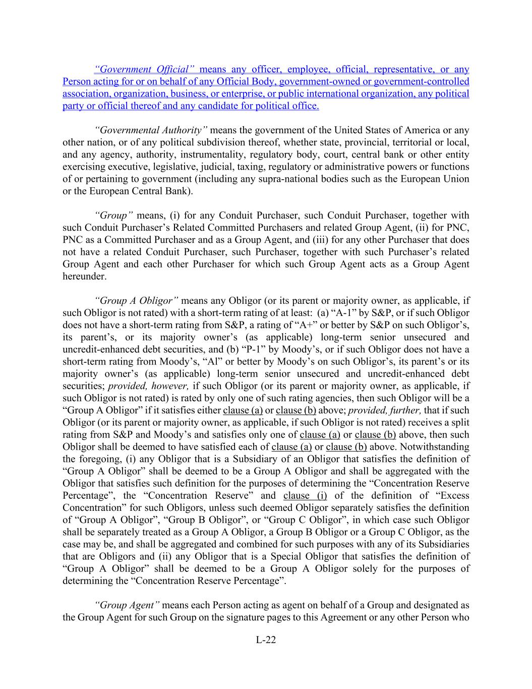L-22 “Government Official” means any officer, employee, official, representative, or any Person acting for or on behalf of any Official Body, government-owned or government-controlled association, organization, business, or enterprise, or public international organization, any political party or official thereof and any candidate for political office. “Governmental Authority” means the government of the United States of America or any other nation, or of any political subdivision thereof, whether state, provincial, territorial or local, and any agency, authority, instrumentality, regulatory body, court, central bank or other entity exercising executive, legislative, judicial, taxing, regulatory or administrative powers or functions of or pertaining to government (including any supra-national bodies such as the European Union or the European Central Bank). “Group” means, (i) for any Conduit Purchaser, such Conduit Purchaser, together with such Conduit Purchaser’s Related Committed Purchasers and related Group Agent, (ii) for PNC, PNC as a Committed Purchaser and as a Group Agent, and (iii) for any other Purchaser that does not have a related Conduit Purchaser, such Purchaser, together with such Purchaser’s related Group Agent and each other Purchaser for which such Group Agent acts as a Group Agent hereunder. “Group A Obligor” means any Obligor (or its parent or majority owner, as applicable, if such Obligor is not rated) with a short-term rating of at least: (a) “A-1” by S&P, or if such Obligor does not have a short-term rating from S&P, a rating of “A+” or better by S&P on such Obligor’s, its parent’s, or its majority owner’s (as applicable) long-term senior unsecured and uncredit-enhanced debt securities, and (b) “P-1” by Moody’s, or if such Obligor does not have a short-term rating from Moody’s, “Al” or better by Moody’s on such Obligor’s, its parent’s or its majority owner’s (as applicable) long-term senior unsecured and uncredit-enhanced debt securities; provided, however, if such Obligor (or its parent or majority owner, as applicable, if such Obligor is not rated) is rated by only one of such rating agencies, then such Obligor will be a “Group A Obligor” if it satisfies either clause (a) or clause (b) above; provided, further, that if such Obligor (or its parent or majority owner, as applicable, if such Obligor is not rated) receives a split rating from S&P and Moody’s and satisfies only one of clause (a) or clause (b) above, then such Obligor shall be deemed to have satisfied each of clause (a) or clause (b) above. Notwithstanding the foregoing, (i) any Obligor that is a Subsidiary of an Obligor that satisfies the definition of “Group A Obligor” shall be deemed to be a Group A Obligor and shall be aggregated with the Obligor that satisfies such definition for the purposes of determining the “Concentration Reserve Percentage”, the “Concentration Reserve” and clause (i) of the definition of “Excess Concentration” for such Obligors, unless such deemed Obligor separately satisfies the definition of “Group A Obligor”, “Group B Obligor”, or “Group C Obligor”, in which case such Obligor shall be separately treated as a Group A Obligor, a Group B Obligor or a Group C Obligor, as the case may be, and shall be aggregated and combined for such purposes with any of its Subsidiaries that are Obligors and (ii) any Obligor that is a Special Obligor that satisfies the definition of “Group A Obligor” shall be deemed to be a Group A Obligor solely for the purposes of determining the “Concentration Reserve Percentage”. “Group Agent” means each Person acting as agent on behalf of a Group and designated as the Group Agent for such Group on the signature pages to this Agreement or any other Person who
