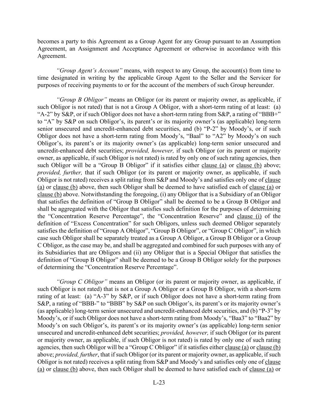 L-23 becomes a party to this Agreement as a Group Agent for any Group pursuant to an Assumption Agreement, an Assignment and Acceptance Agreement or otherwise in accordance with this Agreement. “Group Agent’s Account” means, with respect to any Group, the account(s) from time to time designated in writing by the applicable Group Agent to the Seller and the Servicer for purposes of receiving payments to or for the account of the members of such Group hereunder. “Group B Obligor” means an Obligor (or its parent or majority owner, as applicable, if such Obligor is not rated) that is not a Group A Obligor, with a short-term rating of at least: (a) “A-2” by S&P, or if such Obligor does not have a short-term rating from S&P, a rating of “BBB+” to “A” by S&P on such Obligor’s, its parent’s or its majority owner’s (as applicable) long-term senior unsecured and uncredit-enhanced debt securities, and (b) “P-2” by Moody’s, or if such Obligor does not have a short-term rating from Moody’s, “Baal” to “A2” by Moody’s on such Obligor’s, its parent’s or its majority owner’s (as applicable) long-term senior unsecured and uncredit-enhanced debt securities; provided, however, if such Obligor (or its parent or majority owner, as applicable, if such Obligor is not rated) is rated by only one of such rating agencies, then such Obligor will be a “Group B Obligor” if it satisfies either clause (a) or clause (b) above; provided, further, that if such Obligor (or its parent or majority owner, as applicable, if such Obligor is not rated) receives a split rating from S&P and Moody’s and satisfies only one of clause (a) or clause (b) above, then such Obligor shall be deemed to have satisfied each of clause (a) or clause (b) above. Notwithstanding the foregoing, (i) any Obligor that is a Subsidiary of an Obligor that satisfies the definition of “Group B Obligor” shall be deemed to be a Group B Obligor and shall be aggregated with the Obligor that satisfies such definition for the purposes of determining the “Concentration Reserve Percentage”, the “Concentration Reserve” and clause (i) of the definition of “Excess Concentration” for such Obligors, unless such deemed Obligor separately satisfies the definition of “Group A Obligor”, “Group B Obligor”, or “Group C Obligor”, in which case such Obligor shall be separately treated as a Group A Obligor, a Group B Obligor or a Group C Obligor, as the case may be, and shall be aggregated and combined for such purposes with any of its Subsidiaries that are Obligors and (ii) any Obligor that is a Special Obligor that satisfies the definition of “Group B Obligor” shall be deemed to be a Group B Obligor solely for the purposes of determining the “Concentration Reserve Percentage”. “Group C Obligor” means an Obligor (or its parent or majority owner, as applicable, if such Obligor is not rated) that is not a Group A Obligor or a Group B Obligor, with a short-term rating of at least: (a) “A-3” by S&P, or if such Obligor does not have a short-term rating from S&P, a rating of “BBB-” to “BBB” by S&P on such Obligor’s, its parent’s or its majority owner’s (as applicable) long-term senior unsecured and uncredit-enhanced debt securities, and (b) “P-3” by Moody’s, or if such Obligor does not have a short-term rating from Moody’s, “Baa3” to “Baa2” by Moody’s on such Obligor’s, its parent’s or its majority owner’s (as applicable) long-term senior unsecured and uncredit-enhanced debt securities; provided, however, if such Obligor (or its parent or majority owner, as applicable, if such Obligor is not rated) is rated by only one of such rating agencies, then such Obligor will be a “Group C Obligor” if it satisfies either clause (a) or clause (b) above; provided, further, that if such Obligor (or its parent or majority owner, as applicable, if such Obligor is not rated) receives a split rating from S&P and Moody’s and satisfies only one of clause (a) or clause (b) above, then such Obligor shall be deemed to have satisfied each of clause (a) or