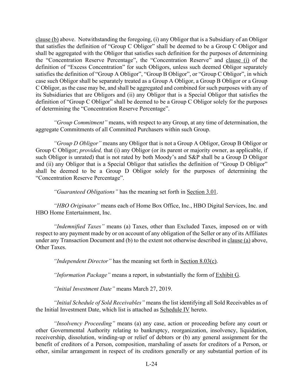 L-24 clause (b) above. Notwithstanding the foregoing, (i) any Obligor that is a Subsidiary of an Obligor that satisfies the definition of “Group C Obligor” shall be deemed to be a Group C Obligor and shall be aggregated with the Obligor that satisfies such definition for the purposes of determining the “Concentration Reserve Percentage”, the “Concentration Reserve” and clause (i) of the definition of “Excess Concentration” for such Obligors, unless such deemed Obligor separately satisfies the definition of “Group A Obligor”, “Group B Obligor”, or “Group C Obligor”, in which case such Obligor shall be separately treated as a Group A Obligor, a Group B Obligor or a Group C Obligor, as the case may be, and shall be aggregated and combined for such purposes with any of its Subsidiaries that are Obligors and (ii) any Obligor that is a Special Obligor that satisfies the definition of “Group C Obligor” shall be deemed to be a Group C Obligor solely for the purposes of determining the “Concentration Reserve Percentage”. “Group Commitment” means, with respect to any Group, at any time of determination, the aggregate Commitments of all Committed Purchasers within such Group. “Group D Obligor” means any Obligor that is not a Group A Obligor, Group B Obligor or Group C Obligor; provided, that (i) any Obligor (or its parent or majority owner, as applicable, if such Obligor is unrated) that is not rated by both Moody’s and S&P shall be a Group D Obligor and (ii) any Obligor that is a Special Obligor that satisfies the definition of “Group D Obligor” shall be deemed to be a Group D Obligor solely for the purposes of determining the “Concentration Reserve Percentage”. “Guaranteed Obligations” has the meaning set forth in Section 3.01. “HBO Originator” means each of Home Box Office, Inc., HBO Digital Services, Inc. and HBO Home Entertainment, Inc. “Indemnified Taxes” means (a) Taxes, other than Excluded Taxes, imposed on or with respect to any payment made by or on account of any obligation of the Seller or any of its Affiliates under any Transaction Document and (b) to the extent not otherwise described in clause (a) above, Other Taxes. “Independent Director” has the meaning set forth in Section 8.03(c). “Information Package” means a report, in substantially the form of Exhibit G. “Initial Investment Date” means March 27, 2019. “Initial Schedule of Sold Receivables” means the list identifying all Sold Receivables as of the Initial Investment Date, which list is attached as Schedule IV hereto. “Insolvency Proceeding” means (a) any case, action or proceeding before any court or other Governmental Authority relating to bankruptcy, reorganization, insolvency, liquidation, receivership, dissolution, winding-up or relief of debtors or (b) any general assignment for the benefit of creditors of a Person, composition, marshaling of assets for creditors of a Person, or other, similar arrangement in respect of its creditors generally or any substantial portion of its