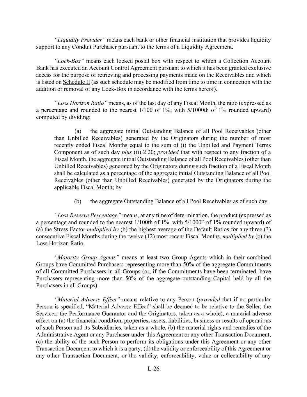 L-26 “Liquidity Provider” means each bank or other financial institution that provides liquidity support to any Conduit Purchaser pursuant to the terms of a Liquidity Agreement. “Lock-Box” means each locked postal box with respect to which a Collection Account Bank has executed an Account Control Agreement pursuant to which it has been granted exclusive access for the purpose of retrieving and processing payments made on the Receivables and which is listed on Schedule II (as such schedule may be modified from time to time in connection with the addition or removal of any Lock-Box in accordance with the terms hereof). “Loss Horizon Ratio” means, as of the last day of any Fiscal Month, the ratio (expressed as a percentage and rounded to the nearest 1/100 of 1%, with 5/1000th of 1% rounded upward) computed by dividing: (a) the aggregate initial Outstanding Balance of all Pool Receivables (other than Unbilled Receivables) generated by the Originators during the number of most recently ended Fiscal Months equal to the sum of (i) the Unbilled and Payment Terms Component as of such day plus (ii) 2.20; provided that with respect to any fraction of a Fiscal Month, the aggregate initial Outstanding Balance of all Pool Receivables (other than Unbilled Receivables) generated by the Originators during such fraction of a Fiscal Month shall be calculated as a percentage of the aggregate initial Outstanding Balance of all Pool Receivables (other than Unbilled Receivables) generated by the Originators during the applicable Fiscal Month; by (b) the aggregate Outstanding Balance of all Pool Receivables as of such day. “Loss Reserve Percentage” means, at any time of determination, the product (expressed as a percentage and rounded to the nearest 1/100th of 1%, with 5/1000th of 1% rounded upward) of (a) the Stress Factor multiplied by (b) the highest average of the Default Ratios for any three (3) consecutive Fiscal Months during the twelve (12) most recent Fiscal Months, multiplied by (c) the Loss Horizon Ratio. “Majority Group Agents” means at least two Group Agents which in their combined Groups have Committed Purchasers representing more than 50% of the aggregate Commitments of all Committed Purchasers in all Groups (or, if the Commitments have been terminated, have Purchasers representing more than 50% of the aggregate outstanding Capital held by all the Purchasers in all Groups). “Material Adverse Effect” means relative to any Person (provided that if no particular Person is specified, “Material Adverse Effect” shall be deemed to be relative to the Seller, the Servicer, the Performance Guarantor and the Originators, taken as a whole), a material adverse effect on (a) the financial condition, properties, assets, liabilities, business or results of operations of such Person and its Subsidiaries, taken as a whole, (b) the material rights and remedies of the Administrative Agent or any Purchaser under this Agreement or any other Transaction Document, (c) the ability of the such Person to perform its obligations under this Agreement or any other Transaction Document to which it is a party, (d) the validity or enforceability of this Agreement or any other Transaction Document, or the validity, enforceability, value or collectability of any