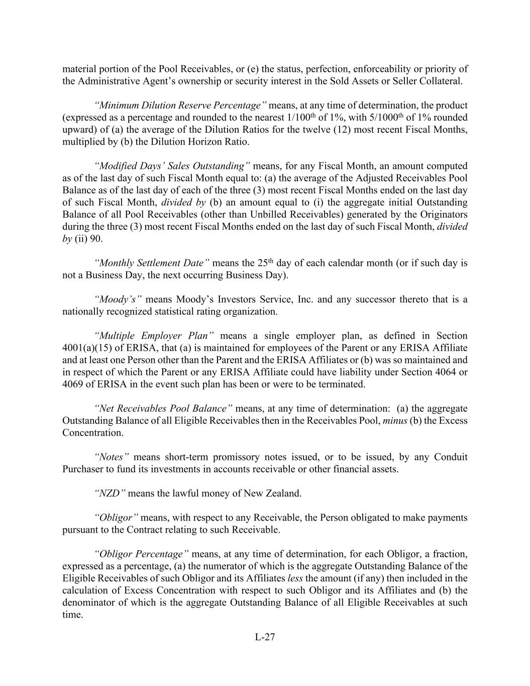 L-27 material portion of the Pool Receivables, or (e) the status, perfection, enforceability or priority of the Administrative Agent’s ownership or security interest in the Sold Assets or Seller Collateral. “Minimum Dilution Reserve Percentage” means, at any time of determination, the product (expressed as a percentage and rounded to the nearest 1/100th of 1%, with 5/1000th of 1% rounded upward) of (a) the average of the Dilution Ratios for the twelve (12) most recent Fiscal Months, multiplied by (b) the Dilution Horizon Ratio. “Modified Days’ Sales Outstanding” means, for any Fiscal Month, an amount computed as of the last day of such Fiscal Month equal to: (a) the average of the Adjusted Receivables Pool Balance as of the last day of each of the three (3) most recent Fiscal Months ended on the last day of such Fiscal Month, divided by (b) an amount equal to (i) the aggregate initial Outstanding Balance of all Pool Receivables (other than Unbilled Receivables) generated by the Originators during the three (3) most recent Fiscal Months ended on the last day of such Fiscal Month, divided by (ii) 90. “Monthly Settlement Date” means the 25th day of each calendar month (or if such day is not a Business Day, the next occurring Business Day). “Moody’s” means Moody’s Investors Service, Inc. and any successor thereto that is a nationally recognized statistical rating organization. “Multiple Employer Plan” means a single employer plan, as defined in Section 4001(a)(15) of ERISA, that (a) is maintained for employees of the Parent or any ERISA Affiliate and at least one Person other than the Parent and the ERISA Affiliates or (b) was so maintained and in respect of which the Parent or any ERISA Affiliate could have liability under Section 4064 or 4069 of ERISA in the event such plan has been or were to be terminated. “Net Receivables Pool Balance” means, at any time of determination: (a) the aggregate Outstanding Balance of all Eligible Receivables then in the Receivables Pool, minus (b) the Excess Concentration. “Notes” means short-term promissory notes issued, or to be issued, by any Conduit Purchaser to fund its investments in accounts receivable or other financial assets. “NZD” means the lawful money of New Zealand. “Obligor” means, with respect to any Receivable, the Person obligated to make payments pursuant to the Contract relating to such Receivable. “Obligor Percentage” means, at any time of determination, for each Obligor, a fraction, expressed as a percentage, (a) the numerator of which is the aggregate Outstanding Balance of the Eligible Receivables of such Obligor and its Affiliates less the amount (if any) then included in the calculation of Excess Concentration with respect to such Obligor and its Affiliates and (b) the denominator of which is the aggregate Outstanding Balance of all Eligible Receivables at such time.