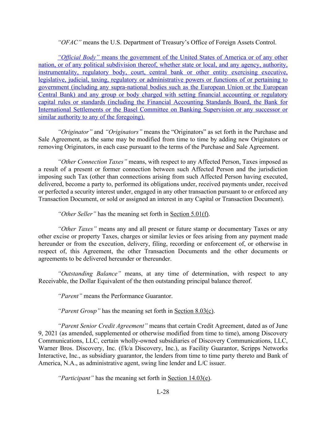 L-28 “OFAC” means the U.S. Department of Treasury’s Office of Foreign Assets Control. “Official Body” means the government of the United States of America or of any other nation, or of any political subdivision thereof, whether state or local, and any agency, authority, instrumentality, regulatory body, court, central bank or other entity exercising executive, legislative, judicial, taxing, regulatory or administrative powers or functions of or pertaining to government (including any supra-national bodies such as the European Union or the European Central Bank) and any group or body charged with setting financial accounting or regulatory capital rules or standards (including the Financial Accounting Standards Board, the Bank for International Settlements or the Basel Committee on Banking Supervision or any successor or similar authority to any of the foregoing). “Originator” and “Originators” means the “Originators” as set forth in the Purchase and Sale Agreement, as the same may be modified from time to time by adding new Originators or removing Originators, in each case pursuant to the terms of the Purchase and Sale Agreement. “Other Connection Taxes” means, with respect to any Affected Person, Taxes imposed as a result of a present or former connection between such Affected Person and the jurisdiction imposing such Tax (other than connections arising from such Affected Person having executed, delivered, become a party to, performed its obligations under, received payments under, received or perfected a security interest under, engaged in any other transaction pursuant to or enforced any Transaction Document, or sold or assigned an interest in any Capital or Transaction Document). “Other Seller” has the meaning set forth in Section 5.01(f). “Other Taxes” means any and all present or future stamp or documentary Taxes or any other excise or property Taxes, charges or similar levies or fees arising from any payment made hereunder or from the execution, delivery, filing, recording or enforcement of, or otherwise in respect of, this Agreement, the other Transaction Documents and the other documents or agreements to be delivered hereunder or thereunder. “Outstanding Balance” means, at any time of determination, with respect to any Receivable, the Dollar Equivalent of the then outstanding principal balance thereof. “Parent” means the Performance Guarantor. “Parent Group” has the meaning set forth in Section 8.03(c). “Parent Senior Credit Agreement” means that certain Credit Agreement, dated as of June 9, 2021 (as amended, supplemented or otherwise modified from time to time), among Discovery Communications, LLC, certain wholly-owned subsidiaries of Discovery Communications, LLC, Warner Bros. Discovery, Inc. (f/k/a Discovery, Inc.), as Facility Guarantor, Scripps Networks Interactive, Inc., as subsidiary guarantor, the lenders from time to time party thereto and Bank of America, N.A., as administrative agent, swing line lender and L/C issuer. “Participant” has the meaning set forth in Section 14.03(e).