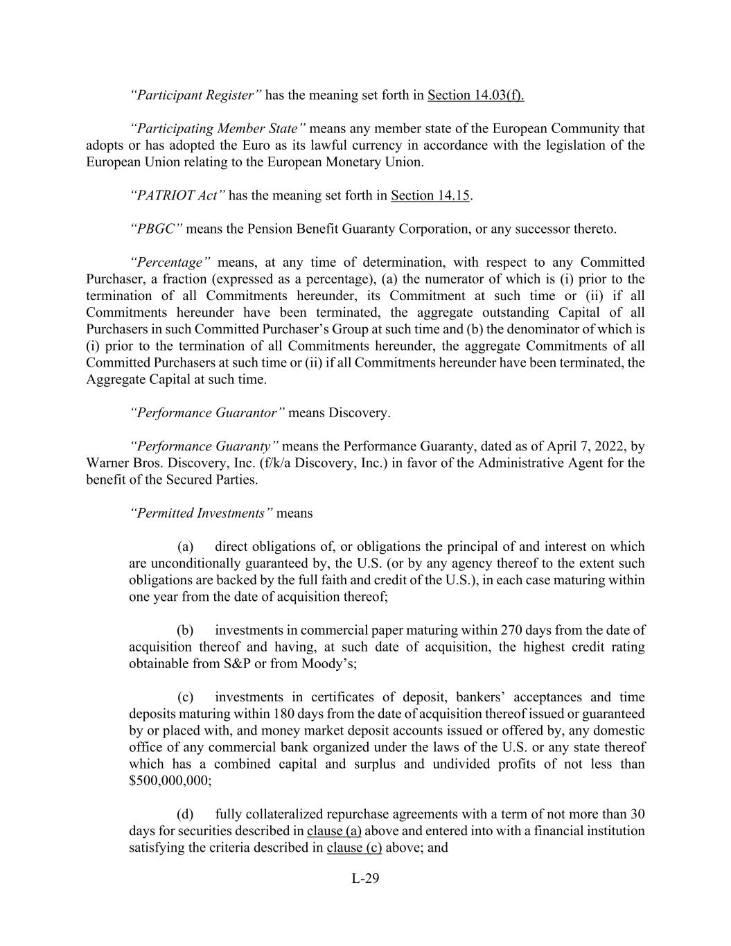 L-29 “Participant Register” has the meaning set forth in Section 14.03(f). “Participating Member State” means any member state of the European Community that adopts or has adopted the Euro as its lawful currency in accordance with the legislation of the European Union relating to the European Monetary Union. “PATRIOT Act” has the meaning set forth in Section 14.15. “PBGC” means the Pension Benefit Guaranty Corporation, or any successor thereto. “Percentage” means, at any time of determination, with respect to any Committed Purchaser, a fraction (expressed as a percentage), (a) the numerator of which is (i) prior to the termination of all Commitments hereunder, its Commitment at such time or (ii) if all Commitments hereunder have been terminated, the aggregate outstanding Capital of all Purchasers in such Committed Purchaser’s Group at such time and (b) the denominator of which is (i) prior to the termination of all Commitments hereunder, the aggregate Commitments of all Committed Purchasers at such time or (ii) if all Commitments hereunder have been terminated, the Aggregate Capital at such time. “Performance Guarantor” means Discovery. “Performance Guaranty” means the Performance Guaranty, dated as of April 7, 2022, by Warner Bros. Discovery, Inc. (f/k/a Discovery, Inc.) in favor of the Administrative Agent for the benefit of the Secured Parties. “Permitted Investments” means (a) direct obligations of, or obligations the principal of and interest on which are unconditionally guaranteed by, the U.S. (or by any agency thereof to the extent such obligations are backed by the full faith and credit of the U.S.), in each case maturing within one year from the date of acquisition thereof; (b) investments in commercial paper maturing within 270 days from the date of acquisition thereof and having, at such date of acquisition, the highest credit rating obtainable from S&P or from Moody’s; (c) investments in certificates of deposit, bankers’ acceptances and time deposits maturing within 180 days from the date of acquisition thereof issued or guaranteed by or placed with, and money market deposit accounts issued or offered by, any domestic office of any commercial bank organized under the laws of the U.S. or any state thereof which has a combined capital and surplus and undivided profits of not less than $500,000,000; (d) fully collateralized repurchase agreements with a term of not more than 30 days for securities described in clause (a) above and entered into with a financial institution satisfying the criteria described in clause (c) above; and