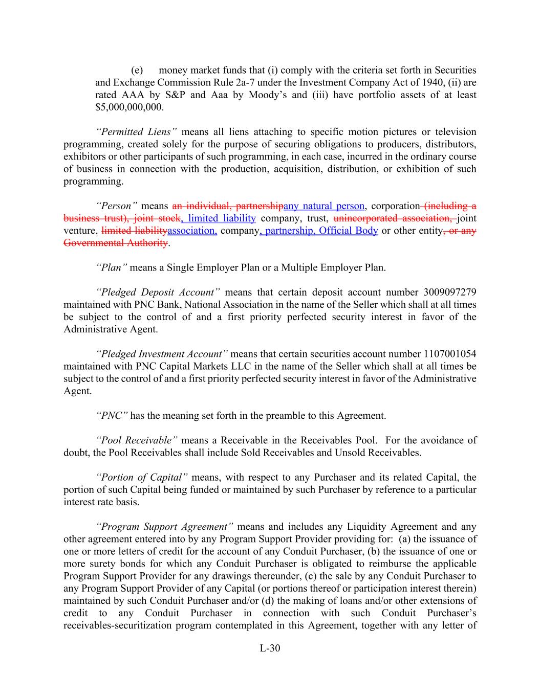 L-30 (e) money market funds that (i) comply with the criteria set forth in Securities and Exchange Commission Rule 2a-7 under the Investment Company Act of 1940, (ii) are rated AAA by S&P and Aaa by Moody’s and (iii) have portfolio assets of at least $5,000,000,000. “Permitted Liens” means all liens attaching to specific motion pictures or television programming, created solely for the purpose of securing obligations to producers, distributors, exhibitors or other participants of such programming, in each case, incurred in the ordinary course of business in connection with the production, acquisition, distribution, or exhibition of such programming. “Person” means an individual, partnershipany natural person, corporation (including a business trust), joint stock, limited liability company, trust, unincorporated association, joint venture, limited liabilityassociation, company, partnership, Official Body or other entity, or any Governmental Authority. “Plan” means a Single Employer Plan or a Multiple Employer Plan. “Pledged Deposit Account” means that certain deposit account number 3009097279 maintained with PNC Bank, National Association in the name of the Seller which shall at all times be subject to the control of and a first priority perfected security interest in favor of the Administrative Agent. “Pledged Investment Account” means that certain securities account number 1107001054 maintained with PNC Capital Markets LLC in the name of the Seller which shall at all times be subject to the control of and a first priority perfected security interest in favor of the Administrative Agent. “PNC” has the meaning set forth in the preamble to this Agreement. “Pool Receivable” means a Receivable in the Receivables Pool. For the avoidance of doubt, the Pool Receivables shall include Sold Receivables and Unsold Receivables. “Portion of Capital” means, with respect to any Purchaser and its related Capital, the portion of such Capital being funded or maintained by such Purchaser by reference to a particular interest rate basis. “Program Support Agreement” means and includes any Liquidity Agreement and any other agreement entered into by any Program Support Provider providing for: (a) the issuance of one or more letters of credit for the account of any Conduit Purchaser, (b) the issuance of one or more surety bonds for which any Conduit Purchaser is obligated to reimburse the applicable Program Support Provider for any drawings thereunder, (c) the sale by any Conduit Purchaser to any Program Support Provider of any Capital (or portions thereof or participation interest therein) maintained by such Conduit Purchaser and/or (d) the making of loans and/or other extensions of credit to any Conduit Purchaser in connection with such Conduit Purchaser’s receivables-securitization program contemplated in this Agreement, together with any letter of
