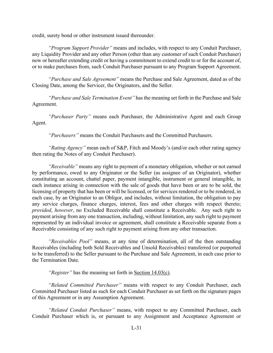 L-31 credit, surety bond or other instrument issued thereunder. “Program Support Provider” means and includes, with respect to any Conduit Purchaser, any Liquidity Provider and any other Person (other than any customer of such Conduit Purchaser) now or hereafter extending credit or having a commitment to extend credit to or for the account of, or to make purchases from, such Conduit Purchaser pursuant to any Program Support Agreement. “Purchase and Sale Agreement” means the Purchase and Sale Agreement, dated as of the Closing Date, among the Servicer, the Originators, and the Seller. “Purchase and Sale Termination Event” has the meaning set forth in the Purchase and Sale Agreement. “Purchaser Party” means each Purchaser, the Administrative Agent and each Group Agent. “Purchasers” means the Conduit Purchasers and the Committed Purchasers. “Rating Agency” mean each of S&P, Fitch and Moody’s (and/or each other rating agency then rating the Notes of any Conduit Purchaser). “Receivable” means any right to payment of a monetary obligation, whether or not earned by performance, owed to any Originator or the Seller (as assignee of an Originator), whether constituting an account, chattel paper, payment intangible, instrument or general intangible, in each instance arising in connection with the sale of goods that have been or are to be sold, the licensing of property that has been or will be licensed, or for services rendered or to be rendered, in each case, by an Originator to an Obligor, and includes, without limitation, the obligation to pay any service charges, finance charges, interest, fees and other charges with respect thereto; provided, however, no Excluded Receivable shall constitute a Receivable. Any such right to payment arising from any one transaction, including, without limitation, any such right to payment represented by an individual invoice or agreement, shall constitute a Receivable separate from a Receivable consisting of any such right to payment arising from any other transaction. “Receivables Pool” means, at any time of determination, all of the then outstanding Receivables (including both Sold Receivables and Unsold Receivables) transferred (or purported to be transferred) to the Seller pursuant to the Purchase and Sale Agreement, in each case prior to the Termination Date. “Register” has the meaning set forth in Section 14.03(c). “Related Committed Purchaser” means with respect to any Conduit Purchaser, each Committed Purchaser listed as such for each Conduit Purchaser as set forth on the signature pages of this Agreement or in any Assumption Agreement. “Related Conduit Purchaser” means, with respect to any Committed Purchaser, each Conduit Purchaser which is, or pursuant to any Assignment and Acceptance Agreement or