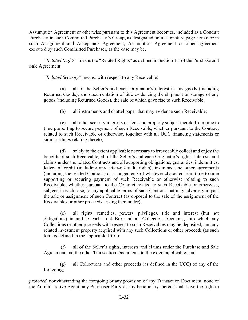 L-32 Assumption Agreement or otherwise pursuant to this Agreement becomes, included as a Conduit Purchaser in such Committed Purchaser’s Group, as designated on its signature page hereto or in such Assignment and Acceptance Agreement, Assumption Agreement or other agreement executed by such Committed Purchaser, as the case may be. “Related Rights” means the “Related Rights” as defined in Section 1.1 of the Purchase and Sale Agreement. “Related Security” means, with respect to any Receivable: (a) all of the Seller’s and each Originator’s interest in any goods (including Returned Goods), and documentation of title evidencing the shipment or storage of any goods (including Returned Goods), the sale of which gave rise to such Receivable; (b) all instruments and chattel paper that may evidence such Receivable; (c) all other security interests or liens and property subject thereto from time to time purporting to secure payment of such Receivable, whether pursuant to the Contract related to such Receivable or otherwise, together with all UCC financing statements or similar filings relating thereto; (d) solely to the extent applicable necessary to irrevocably collect and enjoy the benefits of such Receivable, all of the Seller’s and each Originator’s rights, interests and claims under the related Contracts and all supporting obligations, guaranties, indemnities, letters of credit (including any letter-of-credit rights), insurance and other agreements (including the related Contract) or arrangements of whatever character from time to time supporting or securing payment of such Receivable or otherwise relating to such Receivable, whether pursuant to the Contract related to such Receivable or otherwise, subject, in each case, to any applicable terms of such Contract that may adversely impact the sale or assignment of such Contract (as opposed to the sale of the assignment of the Receivables or other proceeds arising thereunder); (e) all rights, remedies, powers, privileges, title and interest (but not obligations) in and to each Lock-Box and all Collection Accounts, into which any Collections or other proceeds with respect to such Receivables may be deposited, and any related investment property acquired with any such Collections or other proceeds (as such term is defined in the applicable UCC); (f) all of the Seller’s rights, interests and claims under the Purchase and Sale Agreement and the other Transaction Documents to the extent applicable; and (g) all Collections and other proceeds (as defined in the UCC) of any of the foregoing; provided, notwithstanding the foregoing or any provision of any Transaction Document, none of the Administrative Agent, any Purchaser Party or any beneficiary thereof shall have the right to