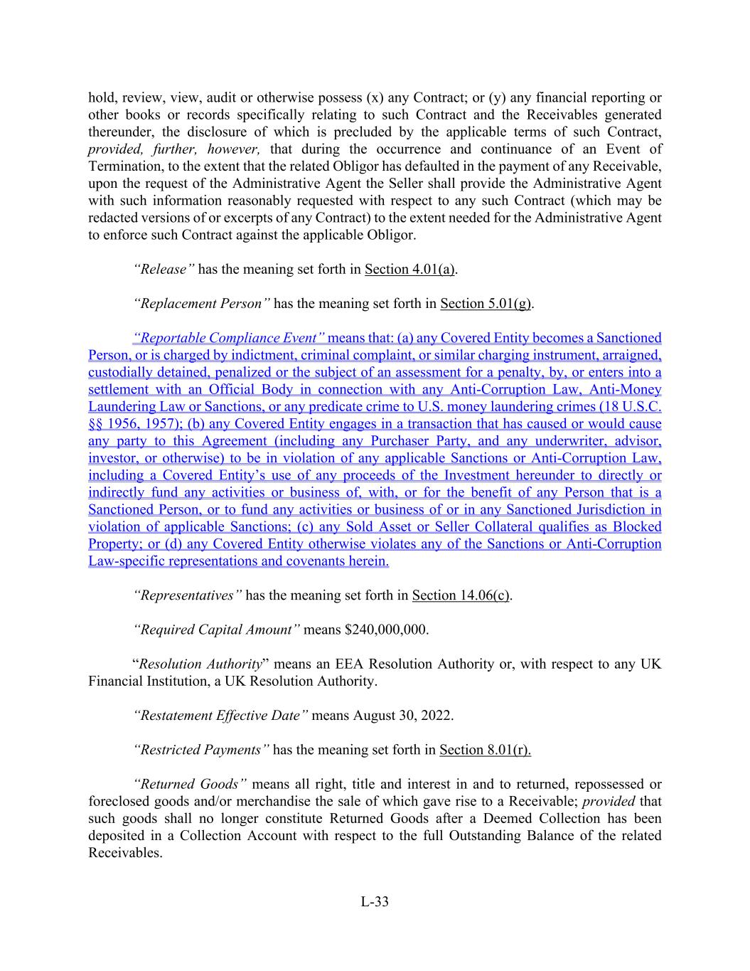 L-33 hold, review, view, audit or otherwise possess (x) any Contract; or (y) any financial reporting or other books or records specifically relating to such Contract and the Receivables generated thereunder, the disclosure of which is precluded by the applicable terms of such Contract, provided, further, however, that during the occurrence and continuance of an Event of Termination, to the extent that the related Obligor has defaulted in the payment of any Receivable, upon the request of the Administrative Agent the Seller shall provide the Administrative Agent with such information reasonably requested with respect to any such Contract (which may be redacted versions of or excerpts of any Contract) to the extent needed for the Administrative Agent to enforce such Contract against the applicable Obligor. “Release” has the meaning set forth in Section 4.01(a). “Replacement Person” has the meaning set forth in Section 5.01(g). “Reportable Compliance Event” means that: (a) any Covered Entity becomes a Sanctioned Person, or is charged by indictment, criminal complaint, or similar charging instrument, arraigned, custodially detained, penalized or the subject of an assessment for a penalty, by, or enters into a settlement with an Official Body in connection with any Anti-Corruption Law, Anti-Money Laundering Law or Sanctions, or any predicate crime to U.S. money laundering crimes (18 U.S.C. §§ 1956, 1957); (b) any Covered Entity engages in a transaction that has caused or would cause any party to this Agreement (including any Purchaser Party, and any underwriter, advisor, investor, or otherwise) to be in violation of any applicable Sanctions or Anti-Corruption Law, including a Covered Entity’s use of any proceeds of the Investment hereunder to directly or indirectly fund any activities or business of, with, or for the benefit of any Person that is a Sanctioned Person, or to fund any activities or business of or in any Sanctioned Jurisdiction in violation of applicable Sanctions; (c) any Sold Asset or Seller Collateral qualifies as Blocked Property; or (d) any Covered Entity otherwise violates any of the Sanctions or Anti-Corruption Law-specific representations and covenants herein. “Representatives” has the meaning set forth in Section 14.06(c). “Required Capital Amount” means $240,000,000. “Resolution Authority” means an EEA Resolution Authority or, with respect to any UK Financial Institution, a UK Resolution Authority. “Restatement Effective Date” means August 30, 2022. “Restricted Payments” has the meaning set forth in Section 8.01(r). “Returned Goods” means all right, title and interest in and to returned, repossessed or foreclosed goods and/or merchandise the sale of which gave rise to a Receivable; provided that such goods shall no longer constitute Returned Goods after a Deemed Collection has been deposited in a Collection Account with respect to the full Outstanding Balance of the related Receivables.