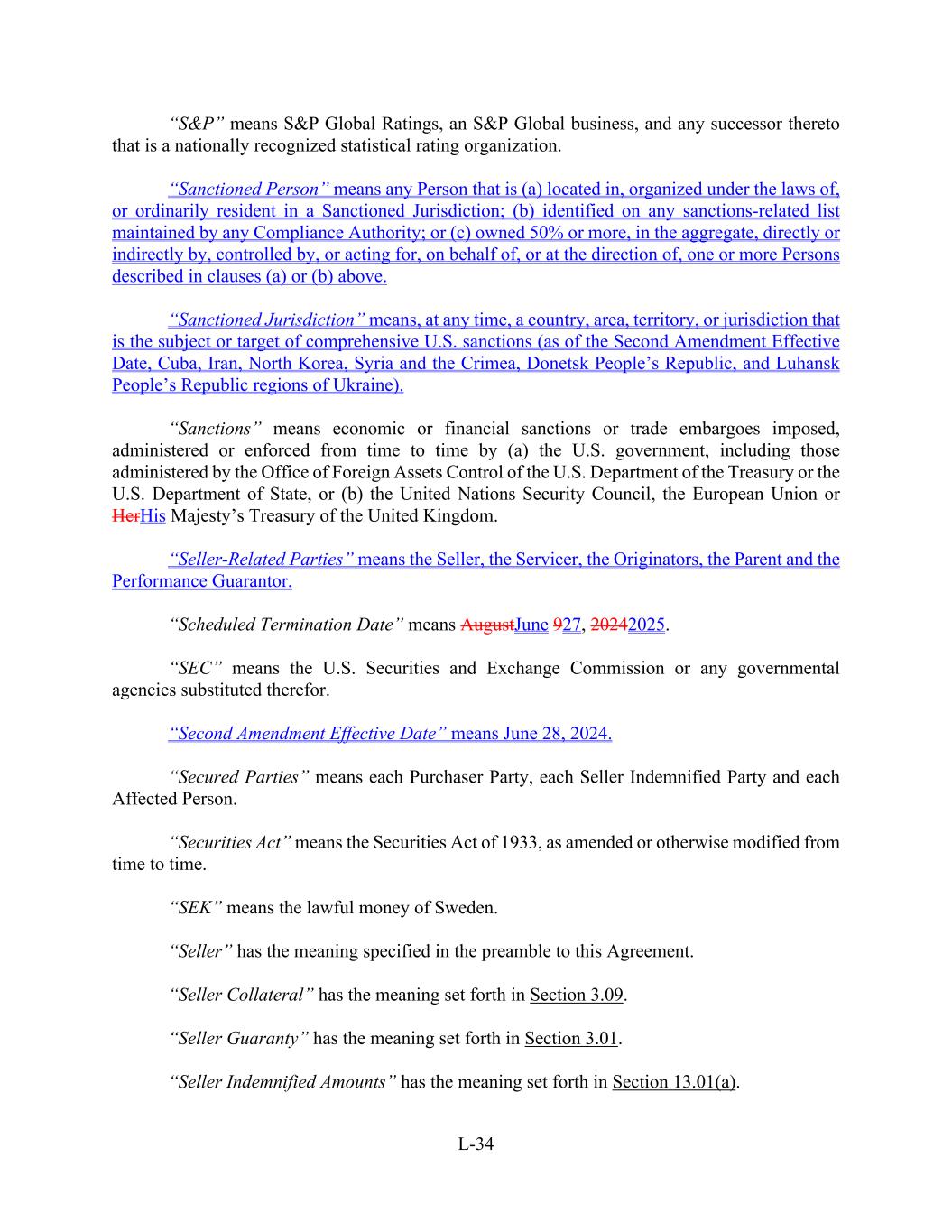 L-34 “S&P” means S&P Global Ratings, an S&P Global business, and any successor thereto that is a nationally recognized statistical rating organization. “Sanctioned Person” means any Person that is (a) located in, organized under the laws of, or ordinarily resident in a Sanctioned Jurisdiction; (b) identified on any sanctions-related list maintained by any Compliance Authority; or (c) owned 50% or more, in the aggregate, directly or indirectly by, controlled by, or acting for, on behalf of, or at the direction of, one or more Persons described in clauses (a) or (b) above. “Sanctioned Jurisdiction” means, at any time, a country, area, territory, or jurisdiction that is the subject or target of comprehensive U.S. sanctions (as of the Second Amendment Effective Date, Cuba, Iran, North Korea, Syria and the Crimea, Donetsk People’s Republic, and Luhansk People’s Republic regions of Ukraine). “Sanctions” means economic or financial sanctions or trade embargoes imposed, administered or enforced from time to time by (a) the U.S. government, including those administered by the Office of Foreign Assets Control of the U.S. Department of the Treasury or the U.S. Department of State, or (b) the United Nations Security Council, the European Union or HerHis Majesty’s Treasury of the United Kingdom. “Seller-Related Parties” means the Seller, the Servicer, the Originators, the Parent and the Performance Guarantor. “Scheduled Termination Date” means AugustJune 927, 20242025. “SEC” means the U.S. Securities and Exchange Commission or any governmental agencies substituted therefor. “Second Amendment Effective Date” means June 28, 2024. “Secured Parties” means each Purchaser Party, each Seller Indemnified Party and each Affected Person. “Securities Act” means the Securities Act of 1933, as amended or otherwise modified from time to time. “SEK” means the lawful money of Sweden. “Seller” has the meaning specified in the preamble to this Agreement. “Seller Collateral” has the meaning set forth in Section 3.09. “Seller Guaranty” has the meaning set forth in Section 3.01. “Seller Indemnified Amounts” has the meaning set forth in Section 13.01(a).
