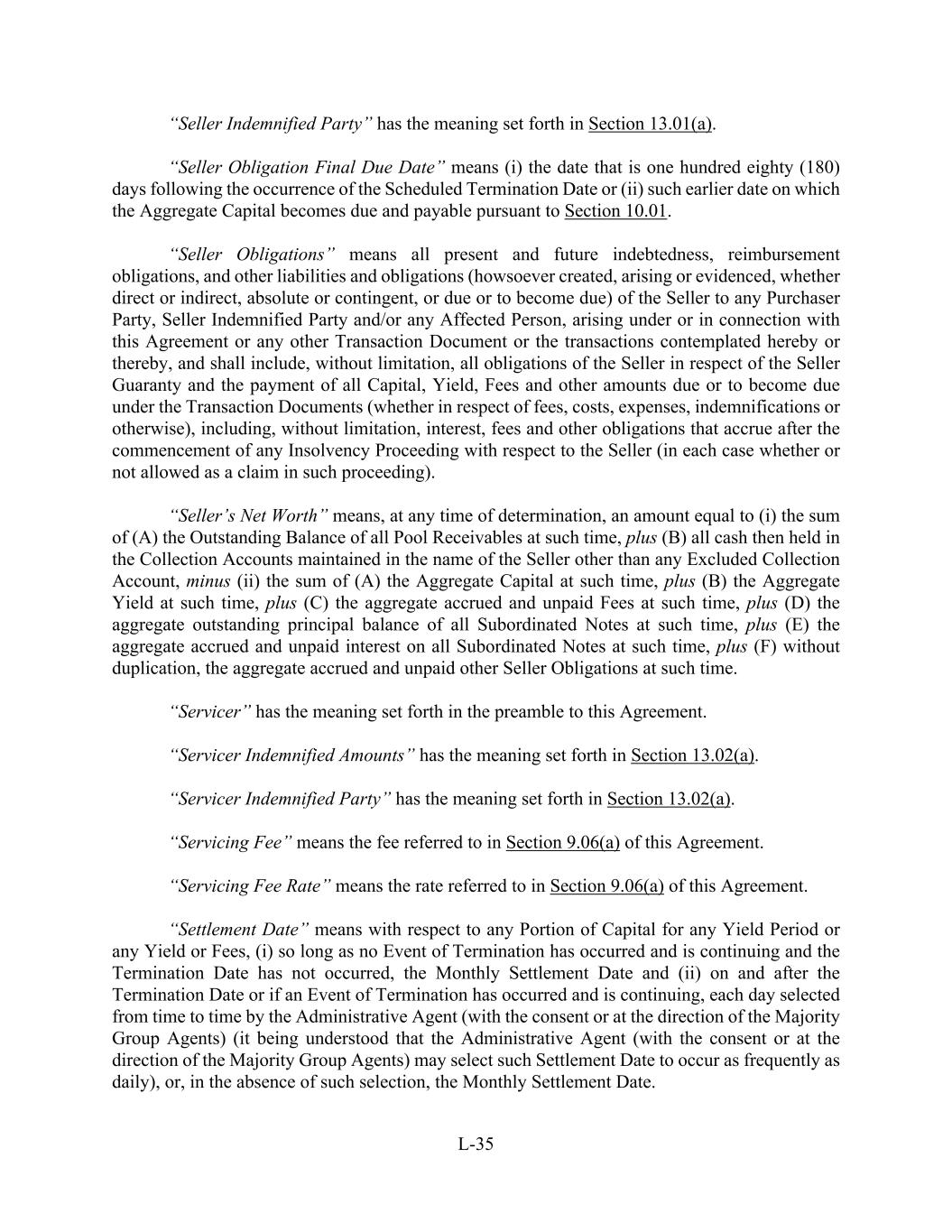 L-35 “Seller Indemnified Party” has the meaning set forth in Section 13.01(a). “Seller Obligation Final Due Date” means (i) the date that is one hundred eighty (180) days following the occurrence of the Scheduled Termination Date or (ii) such earlier date on which the Aggregate Capital becomes due and payable pursuant to Section 10.01. “Seller Obligations” means all present and future indebtedness, reimbursement obligations, and other liabilities and obligations (howsoever created, arising or evidenced, whether direct or indirect, absolute or contingent, or due or to become due) of the Seller to any Purchaser Party, Seller Indemnified Party and/or any Affected Person, arising under or in connection with this Agreement or any other Transaction Document or the transactions contemplated hereby or thereby, and shall include, without limitation, all obligations of the Seller in respect of the Seller Guaranty and the payment of all Capital, Yield, Fees and other amounts due or to become due under the Transaction Documents (whether in respect of fees, costs, expenses, indemnifications or otherwise), including, without limitation, interest, fees and other obligations that accrue after the commencement of any Insolvency Proceeding with respect to the Seller (in each case whether or not allowed as a claim in such proceeding). “Seller’s Net Worth” means, at any time of determination, an amount equal to (i) the sum of (A) the Outstanding Balance of all Pool Receivables at such time, plus (B) all cash then held in the Collection Accounts maintained in the name of the Seller other than any Excluded Collection Account, minus (ii) the sum of (A) the Aggregate Capital at such time, plus (B) the Aggregate Yield at such time, plus (C) the aggregate accrued and unpaid Fees at such time, plus (D) the aggregate outstanding principal balance of all Subordinated Notes at such time, plus (E) the aggregate accrued and unpaid interest on all Subordinated Notes at such time, plus (F) without duplication, the aggregate accrued and unpaid other Seller Obligations at such time. “Servicer” has the meaning set forth in the preamble to this Agreement. “Servicer Indemnified Amounts” has the meaning set forth in Section 13.02(a). “Servicer Indemnified Party” has the meaning set forth in Section 13.02(a). “Servicing Fee” means the fee referred to in Section 9.06(a) of this Agreement. “Servicing Fee Rate” means the rate referred to in Section 9.06(a) of this Agreement. “Settlement Date” means with respect to any Portion of Capital for any Yield Period or any Yield or Fees, (i) so long as no Event of Termination has occurred and is continuing and the Termination Date has not occurred, the Monthly Settlement Date and (ii) on and after the Termination Date or if an Event of Termination has occurred and is continuing, each day selected from time to time by the Administrative Agent (with the consent or at the direction of the Majority Group Agents) (it being understood that the Administrative Agent (with the consent or at the direction of the Majority Group Agents) may select such Settlement Date to occur as frequently as daily), or, in the absence of such selection, the Monthly Settlement Date.