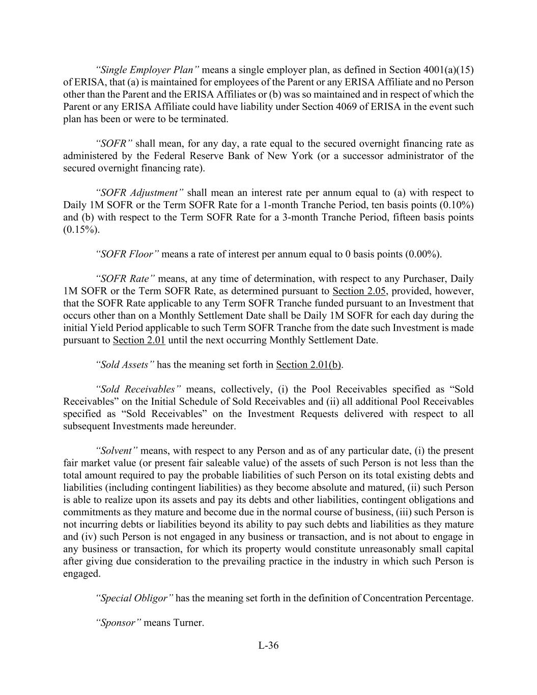 L-36 “Single Employer Plan” means a single employer plan, as defined in Section 4001(a)(15) of ERISA, that (a) is maintained for employees of the Parent or any ERISA Affiliate and no Person other than the Parent and the ERISA Affiliates or (b) was so maintained and in respect of which the Parent or any ERISA Affiliate could have liability under Section 4069 of ERISA in the event such plan has been or were to be terminated. “SOFR” shall mean, for any day, a rate equal to the secured overnight financing rate as administered by the Federal Reserve Bank of New York (or a successor administrator of the secured overnight financing rate). “SOFR Adjustment” shall mean an interest rate per annum equal to (a) with respect to Daily 1M SOFR or the Term SOFR Rate for a 1-month Tranche Period, ten basis points (0.10%) and (b) with respect to the Term SOFR Rate for a 3-month Tranche Period, fifteen basis points (0.15%). “SOFR Floor” means a rate of interest per annum equal to 0 basis points (0.00%). “SOFR Rate” means, at any time of determination, with respect to any Purchaser, Daily 1M SOFR or the Term SOFR Rate, as determined pursuant to Section 2.05, provided, however, that the SOFR Rate applicable to any Term SOFR Tranche funded pursuant to an Investment that occurs other than on a Monthly Settlement Date shall be Daily 1M SOFR for each day during the initial Yield Period applicable to such Term SOFR Tranche from the date such Investment is made pursuant to Section 2.01 until the next occurring Monthly Settlement Date. “Sold Assets” has the meaning set forth in Section 2.01(b). “Sold Receivables” means, collectively, (i) the Pool Receivables specified as “Sold Receivables” on the Initial Schedule of Sold Receivables and (ii) all additional Pool Receivables specified as “Sold Receivables” on the Investment Requests delivered with respect to all subsequent Investments made hereunder. “Solvent” means, with respect to any Person and as of any particular date, (i) the present fair market value (or present fair saleable value) of the assets of such Person is not less than the total amount required to pay the probable liabilities of such Person on its total existing debts and liabilities (including contingent liabilities) as they become absolute and matured, (ii) such Person is able to realize upon its assets and pay its debts and other liabilities, contingent obligations and commitments as they mature and become due in the normal course of business, (iii) such Person is not incurring debts or liabilities beyond its ability to pay such debts and liabilities as they mature and (iv) such Person is not engaged in any business or transaction, and is not about to engage in any business or transaction, for which its property would constitute unreasonably small capital after giving due consideration to the prevailing practice in the industry in which such Person is engaged. “Special Obligor” has the meaning set forth in the definition of Concentration Percentage. “Sponsor” means Turner.