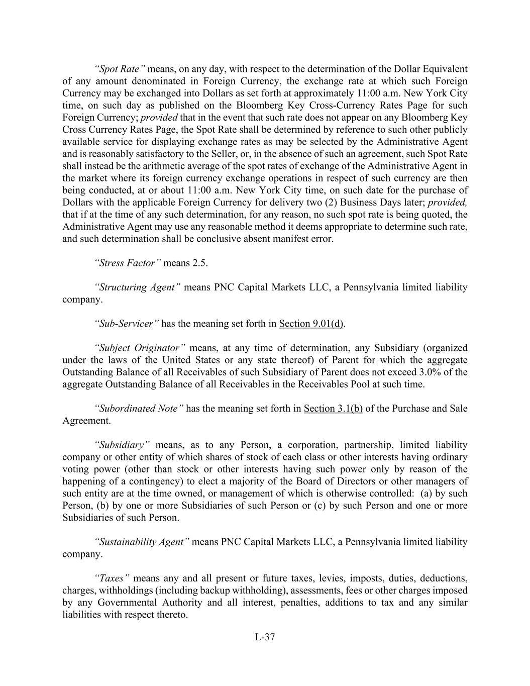 L-37 “Spot Rate” means, on any day, with respect to the determination of the Dollar Equivalent of any amount denominated in Foreign Currency, the exchange rate at which such Foreign Currency may be exchanged into Dollars as set forth at approximately 11:00 a.m. New York City time, on such day as published on the Bloomberg Key Cross-Currency Rates Page for such Foreign Currency; provided that in the event that such rate does not appear on any Bloomberg Key Cross Currency Rates Page, the Spot Rate shall be determined by reference to such other publicly available service for displaying exchange rates as may be selected by the Administrative Agent and is reasonably satisfactory to the Seller, or, in the absence of such an agreement, such Spot Rate shall instead be the arithmetic average of the spot rates of exchange of the Administrative Agent in the market where its foreign currency exchange operations in respect of such currency are then being conducted, at or about 11:00 a.m. New York City time, on such date for the purchase of Dollars with the applicable Foreign Currency for delivery two (2) Business Days later; provided, that if at the time of any such determination, for any reason, no such spot rate is being quoted, the Administrative Agent may use any reasonable method it deems appropriate to determine such rate, and such determination shall be conclusive absent manifest error. “Stress Factor” means 2.5. “Structuring Agent” means PNC Capital Markets LLC, a Pennsylvania limited liability company. “Sub-Servicer” has the meaning set forth in Section 9.01(d). “Subject Originator” means, at any time of determination, any Subsidiary (organized under the laws of the United States or any state thereof) of Parent for which the aggregate Outstanding Balance of all Receivables of such Subsidiary of Parent does not exceed 3.0% of the aggregate Outstanding Balance of all Receivables in the Receivables Pool at such time. “Subordinated Note” has the meaning set forth in Section 3.1(b) of the Purchase and Sale Agreement. “Subsidiary” means, as to any Person, a corporation, partnership, limited liability company or other entity of which shares of stock of each class or other interests having ordinary voting power (other than stock or other interests having such power only by reason of the happening of a contingency) to elect a majority of the Board of Directors or other managers of such entity are at the time owned, or management of which is otherwise controlled: (a) by such Person, (b) by one or more Subsidiaries of such Person or (c) by such Person and one or more Subsidiaries of such Person. “Sustainability Agent” means PNC Capital Markets LLC, a Pennsylvania limited liability company. “Taxes” means any and all present or future taxes, levies, imposts, duties, deductions, charges, withholdings (including backup withholding), assessments, fees or other charges imposed by any Governmental Authority and all interest, penalties, additions to tax and any similar liabilities with respect thereto.