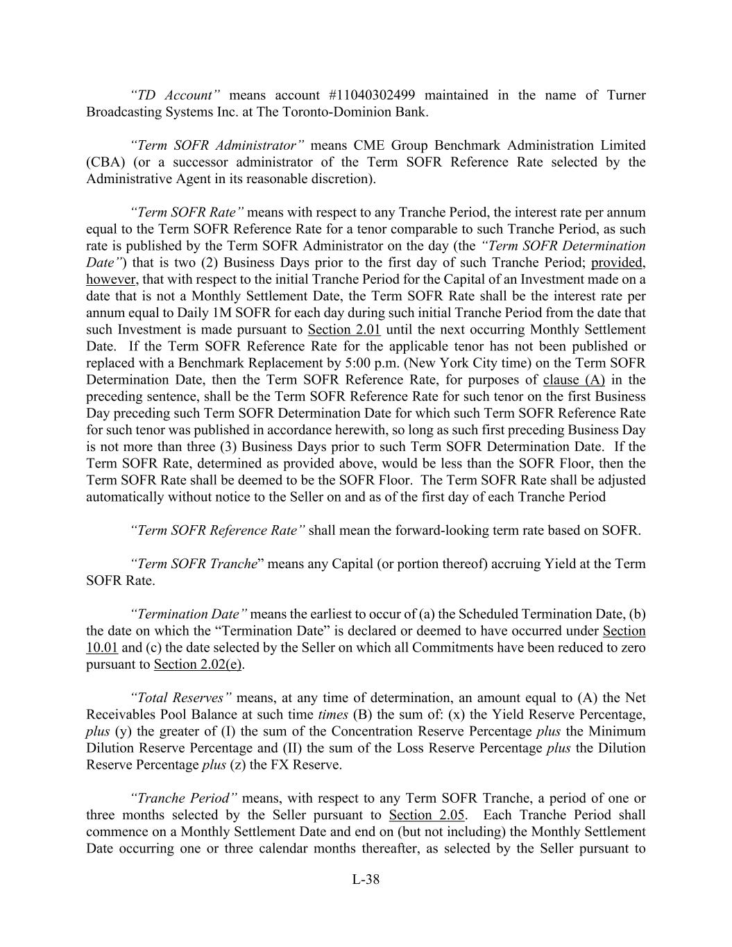 L-38 “TD Account” means account #11040302499 maintained in the name of Turner Broadcasting Systems Inc. at The Toronto-Dominion Bank. “Term SOFR Administrator” means CME Group Benchmark Administration Limited (CBA) (or a successor administrator of the Term SOFR Reference Rate selected by the Administrative Agent in its reasonable discretion). “Term SOFR Rate” means with respect to any Tranche Period, the interest rate per annum equal to the Term SOFR Reference Rate for a tenor comparable to such Tranche Period, as such rate is published by the Term SOFR Administrator on the day (the “Term SOFR Determination Date”) that is two (2) Business Days prior to the first day of such Tranche Period; provided, however, that with respect to the initial Tranche Period for the Capital of an Investment made on a date that is not a Monthly Settlement Date, the Term SOFR Rate shall be the interest rate per annum equal to Daily 1M SOFR for each day during such initial Tranche Period from the date that such Investment is made pursuant to Section 2.01 until the next occurring Monthly Settlement Date. If the Term SOFR Reference Rate for the applicable tenor has not been published or replaced with a Benchmark Replacement by 5:00 p.m. (New York City time) on the Term SOFR Determination Date, then the Term SOFR Reference Rate, for purposes of clause (A) in the preceding sentence, shall be the Term SOFR Reference Rate for such tenor on the first Business Day preceding such Term SOFR Determination Date for which such Term SOFR Reference Rate for such tenor was published in accordance herewith, so long as such first preceding Business Day is not more than three (3) Business Days prior to such Term SOFR Determination Date. If the Term SOFR Rate, determined as provided above, would be less than the SOFR Floor, then the Term SOFR Rate shall be deemed to be the SOFR Floor. The Term SOFR Rate shall be adjusted automatically without notice to the Seller on and as of the first day of each Tranche Period “Term SOFR Reference Rate” shall mean the forward-looking term rate based on SOFR. “Term SOFR Tranche” means any Capital (or portion thereof) accruing Yield at the Term SOFR Rate. “Termination Date” means the earliest to occur of (a) the Scheduled Termination Date, (b) the date on which the “Termination Date” is declared or deemed to have occurred under Section 10.01 and (c) the date selected by the Seller on which all Commitments have been reduced to zero pursuant to Section 2.02(e). “Total Reserves” means, at any time of determination, an amount equal to (A) the Net Receivables Pool Balance at such time times (B) the sum of: (x) the Yield Reserve Percentage, plus (y) the greater of (I) the sum of the Concentration Reserve Percentage plus the Minimum Dilution Reserve Percentage and (II) the sum of the Loss Reserve Percentage plus the Dilution Reserve Percentage plus (z) the FX Reserve. “Tranche Period” means, with respect to any Term SOFR Tranche, a period of one or three months selected by the Seller pursuant to Section 2.05. Each Tranche Period shall commence on a Monthly Settlement Date and end on (but not including) the Monthly Settlement Date occurring one or three calendar months thereafter, as selected by the Seller pursuant to