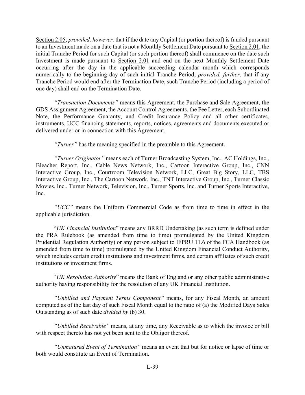 L-39 Section 2.05; provided, however, that if the date any Capital (or portion thereof) is funded pursuant to an Investment made on a date that is not a Monthly Settlement Date pursuant to Section 2.01, the initial Tranche Period for such Capital (or such portion thereof) shall commence on the date such Investment is made pursuant to Section 2.01 and end on the next Monthly Settlement Date occurring after the day in the applicable succeeding calendar month which corresponds numerically to the beginning day of such initial Tranche Period; provided, further, that if any Tranche Period would end after the Termination Date, such Tranche Period (including a period of one day) shall end on the Termination Date. “Transaction Documents” means this Agreement, the Purchase and Sale Agreement, the GDS Assignment Agreement, the Account Control Agreements, the Fee Letter, each Subordinated Note, the Performance Guaranty, and Credit Insurance Policy and all other certificates, instruments, UCC financing statements, reports, notices, agreements and documents executed or delivered under or in connection with this Agreement. “Turner” has the meaning specified in the preamble to this Agreement. “Turner Originator” means each of Turner Broadcasting System, Inc., AC Holdings, Inc., Bleacher Report, Inc., Cable News Network, Inc., Cartoon Interactive Group, Inc., CNN Interactive Group, Inc., Courtroom Television Network, LLC, Great Big Story, LLC, TBS Interactive Group, Inc., The Cartoon Network, Inc., TNT Interactive Group, Inc., Turner Classic Movies, Inc., Turner Network, Television, Inc., Turner Sports, Inc. and Turner Sports Interactive, Inc. “UCC” means the Uniform Commercial Code as from time to time in effect in the applicable jurisdiction. “UK Financial Institution” means any BRRD Undertaking (as such term is defined under the PRA Rulebook (as amended from time to time) promulgated by the United Kingdom Prudential Regulation Authority) or any person subject to IFPRU 11.6 of the FCA Handbook (as amended from time to time) promulgated by the United Kingdom Financial Conduct Authority, which includes certain credit institutions and investment firms, and certain affiliates of such credit institutions or investment firms. “UK Resolution Authority” means the Bank of England or any other public administrative authority having responsibility for the resolution of any UK Financial Institution. “Unbilled and Payment Terms Component” means, for any Fiscal Month, an amount computed as of the last day of such Fiscal Month equal to the ratio of (a) the Modified Days Sales Outstanding as of such date divided by (b) 30. “Unbilled Receivable” means, at any time, any Receivable as to which the invoice or bill with respect thereto has not yet been sent to the Obligor thereof. “Unmatured Event of Termination” means an event that but for notice or lapse of time or both would constitute an Event of Termination.