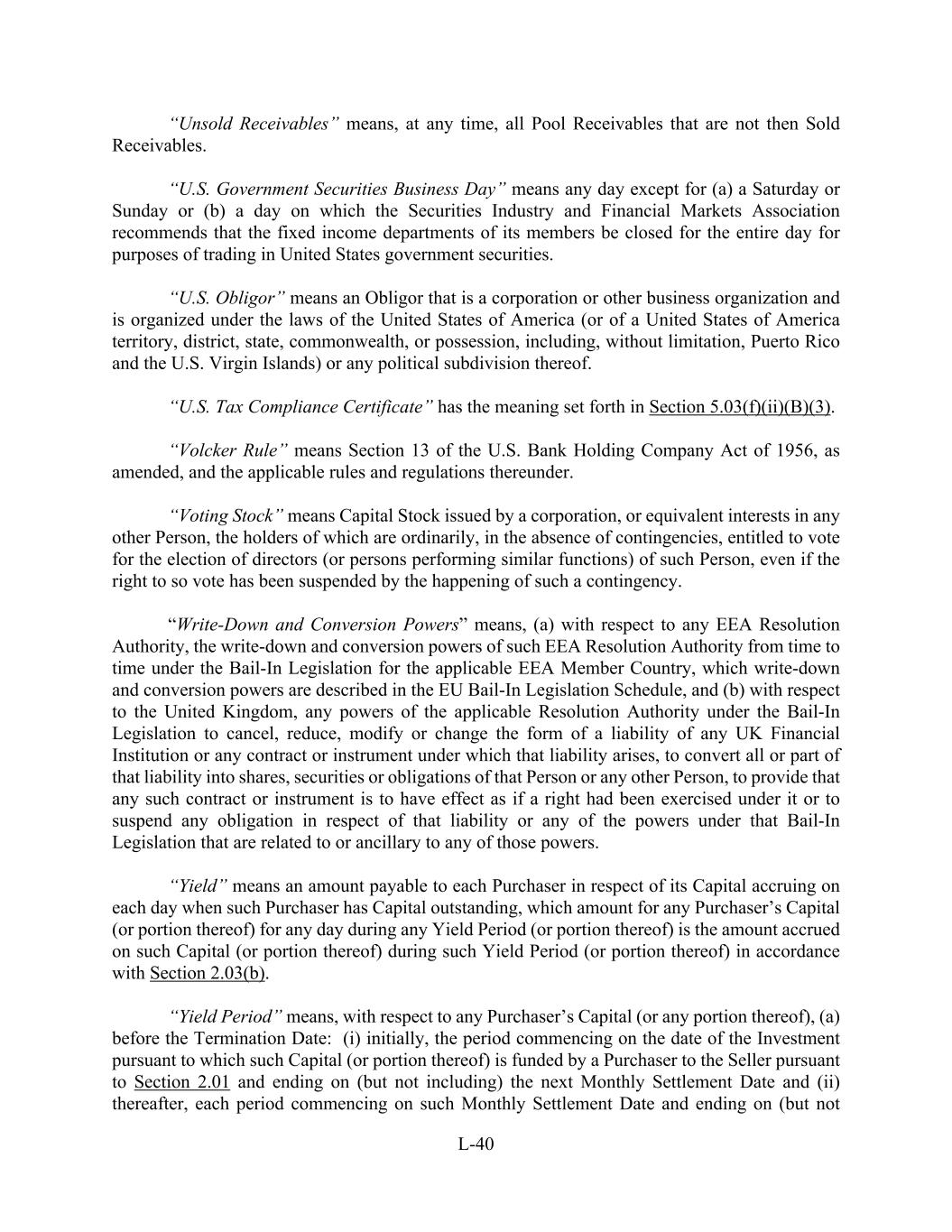 L-40 “Unsold Receivables” means, at any time, all Pool Receivables that are not then Sold Receivables. “U.S. Government Securities Business Day” means any day except for (a) a Saturday or Sunday or (b) a day on which the Securities Industry and Financial Markets Association recommends that the fixed income departments of its members be closed for the entire day for purposes of trading in United States government securities. “U.S. Obligor” means an Obligor that is a corporation or other business organization and is organized under the laws of the United States of America (or of a United States of America territory, district, state, commonwealth, or possession, including, without limitation, Puerto Rico and the U.S. Virgin Islands) or any political subdivision thereof. “U.S. Tax Compliance Certificate” has the meaning set forth in Section 5.03(f)(ii)(B)(3). “Volcker Rule” means Section 13 of the U.S. Bank Holding Company Act of 1956, as amended, and the applicable rules and regulations thereunder. “Voting Stock” means Capital Stock issued by a corporation, or equivalent interests in any other Person, the holders of which are ordinarily, in the absence of contingencies, entitled to vote for the election of directors (or persons performing similar functions) of such Person, even if the right to so vote has been suspended by the happening of such a contingency. “Write-Down and Conversion Powers” means, (a) with respect to any EEA Resolution Authority, the write-down and conversion powers of such EEA Resolution Authority from time to time under the Bail-In Legislation for the applicable EEA Member Country, which write-down and conversion powers are described in the EU Bail-In Legislation Schedule, and (b) with respect to the United Kingdom, any powers of the applicable Resolution Authority under the Bail-In Legislation to cancel, reduce, modify or change the form of a liability of any UK Financial Institution or any contract or instrument under which that liability arises, to convert all or part of that liability into shares, securities or obligations of that Person or any other Person, to provide that any such contract or instrument is to have effect as if a right had been exercised under it or to suspend any obligation in respect of that liability or any of the powers under that Bail-In Legislation that are related to or ancillary to any of those powers. “Yield” means an amount payable to each Purchaser in respect of its Capital accruing on each day when such Purchaser has Capital outstanding, which amount for any Purchaser’s Capital (or portion thereof) for any day during any Yield Period (or portion thereof) is the amount accrued on such Capital (or portion thereof) during such Yield Period (or portion thereof) in accordance with Section 2.03(b). “Yield Period” means, with respect to any Purchaser’s Capital (or any portion thereof), (a) before the Termination Date: (i) initially, the period commencing on the date of the Investment pursuant to which such Capital (or portion thereof) is funded by a Purchaser to the Seller pursuant to Section 2.01 and ending on (but not including) the next Monthly Settlement Date and (ii) thereafter, each period commencing on such Monthly Settlement Date and ending on (but not