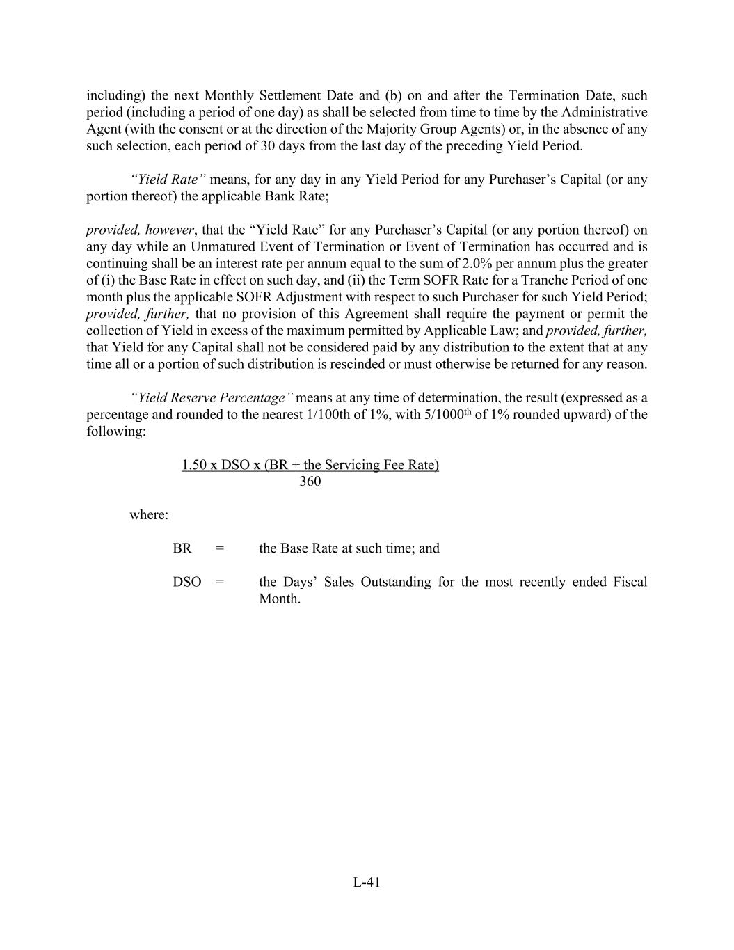L-41 including) the next Monthly Settlement Date and (b) on and after the Termination Date, such period (including a period of one day) as shall be selected from time to time by the Administrative Agent (with the consent or at the direction of the Majority Group Agents) or, in the absence of any such selection, each period of 30 days from the last day of the preceding Yield Period. “Yield Rate” means, for any day in any Yield Period for any Purchaser’s Capital (or any portion thereof) the applicable Bank Rate; provided, however, that the “Yield Rate” for any Purchaser’s Capital (or any portion thereof) on any day while an Unmatured Event of Termination or Event of Termination has occurred and is continuing shall be an interest rate per annum equal to the sum of 2.0% per annum plus the greater of (i) the Base Rate in effect on such day, and (ii) the Term SOFR Rate for a Tranche Period of one month plus the applicable SOFR Adjustment with respect to such Purchaser for such Yield Period; provided, further, that no provision of this Agreement shall require the payment or permit the collection of Yield in excess of the maximum permitted by Applicable Law; and provided, further, that Yield for any Capital shall not be considered paid by any distribution to the extent that at any time all or a portion of such distribution is rescinded or must otherwise be returned for any reason. “Yield Reserve Percentage” means at any time of determination, the result (expressed as a percentage and rounded to the nearest 1/100th of 1%, with 5/1000th of 1% rounded upward) of the following: 1.50 x DSO x (BR + the Servicing Fee Rate) 360 where: BR = the Base Rate at such time; and DSO = the Days’ Sales Outstanding for the most recently ended Fiscal Month.
