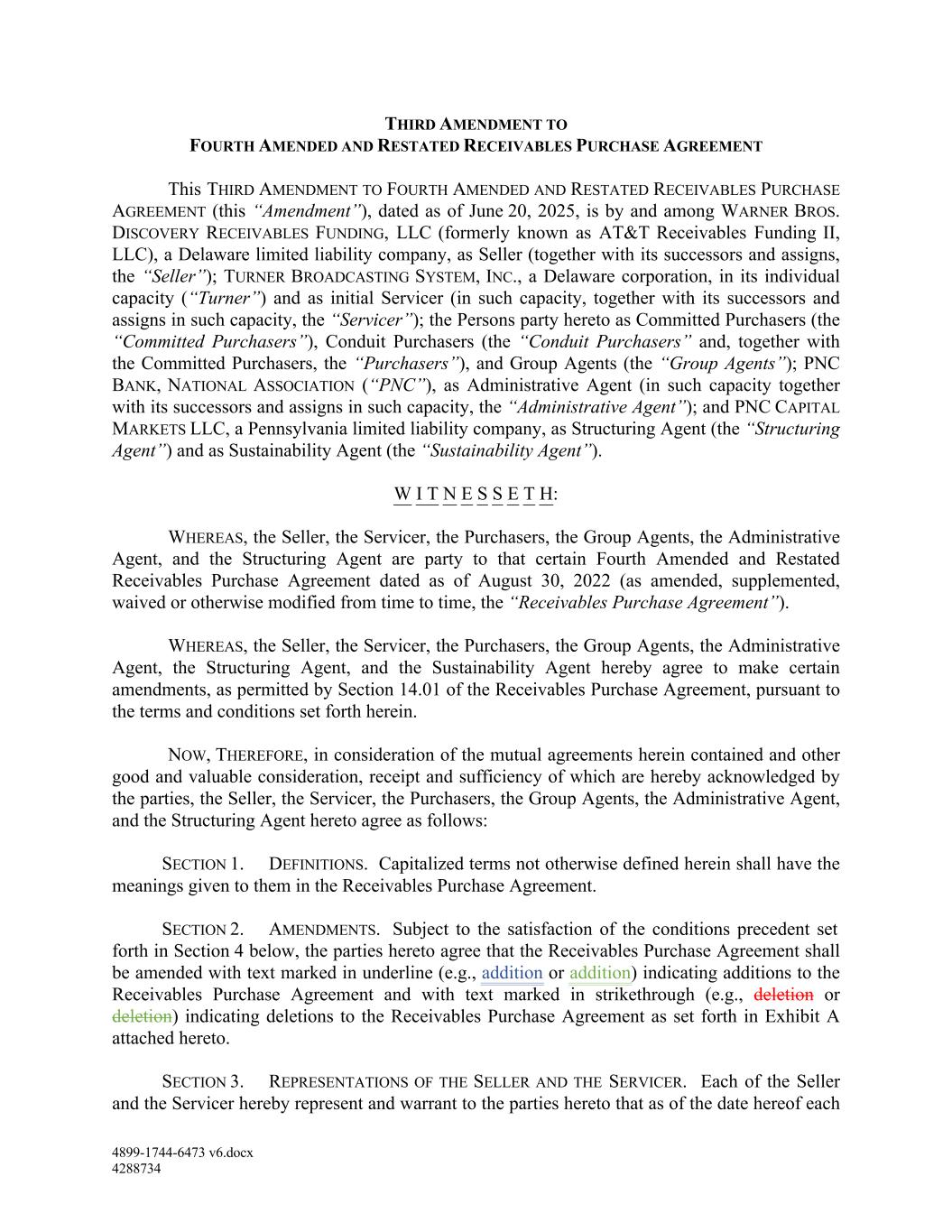 THIRD AMENDMENT TO FOURTH AMENDED AND RESTATED RECEIVABLES PURCHASE AGREEMENT This THIRD AMENDMENT TO FOURTH AMENDED AND RESTATED RECEIVABLES PURCHASE AGREEMENT (this “Amendment”), dated as of June 20, 2025, is by and among WARNER BROS. DISCOVERY RECEIVABLES FUNDING, LLC (formerly known as AT&T Receivables Funding II, LLC), a Delaware limited liability company, as Seller (together with its successors and assigns, the “Seller”); TURNER BROADCASTING SYSTEM, INC., a Delaware corporation, in its individual capacity (“Turner”) and as initial Servicer (in such capacity, together with its successors and assigns in such capacity, the “Servicer”); the Persons party hereto as Committed Purchasers (the “Committed Purchasers”), Conduit Purchasers (the “Conduit Purchasers” and, together with the Committed Purchasers, the “Purchasers”), and Group Agents (the “Group Agents”); PNC BANK, NATIONAL ASSOCIATION (“PNC”), as Administrative Agent (in such capacity together with its successors and assigns in such capacity, the “Administrative Agent”); and PNC CAPITAL MARKETS LLC, a Pennsylvania limited liability company, as Structuring Agent (the “Structuring Agent”) and as Sustainability Agent (the “Sustainability Agent”). W I T N E S S E T H: WHEREAS, the Seller, the Servicer, the Purchasers, the Group Agents, the Administrative Agent, and the Structuring Agent are party to that certain Fourth Amended and Restated Receivables Purchase Agreement dated as of August 30, 2022 (as amended, supplemented, waived or otherwise modified from time to time, the “Receivables Purchase Agreement”). WHEREAS, the Seller, the Servicer, the Purchasers, the Group Agents, the Administrative Agent, the Structuring Agent, and the Sustainability Agent hereby agree to make certain amendments, as permitted by Section 14.01 of the Receivables Purchase Agreement, pursuant to the terms and conditions set forth herein. NOW, THEREFORE, in consideration of the mutual agreements herein contained and other good and valuable consideration, receipt and sufficiency of which are hereby acknowledged by the parties, the Seller, the Servicer, the Purchasers, the Group Agents, the Administrative Agent, and the Structuring Agent hereto agree as follows: SECTION 1. DEFINITIONS. Capitalized terms not otherwise defined herein shall have the meanings given to them in the Receivables Purchase Agreement. SECTION 2. AMENDMENTS. Subject to the satisfaction of the conditions precedent set forth in Section 4 below, the parties hereto agree that the Receivables Purchase Agreement shall be amended with text marked in underline (e.g., addition or addition) indicating additions to the Receivables Purchase Agreement and with text marked in strikethrough (e.g., deletion or deletion) indicating deletions to the Receivables Purchase Agreement as set forth in Exhibit A attached hereto. SECTION 3. REPRESENTATIONS OF THE SELLER AND THE SERVICER. Each of the Seller and the Servicer hereby represent and warrant to the parties hereto that as of the date hereof each 4899-1744-6473 v6.docx 4288734