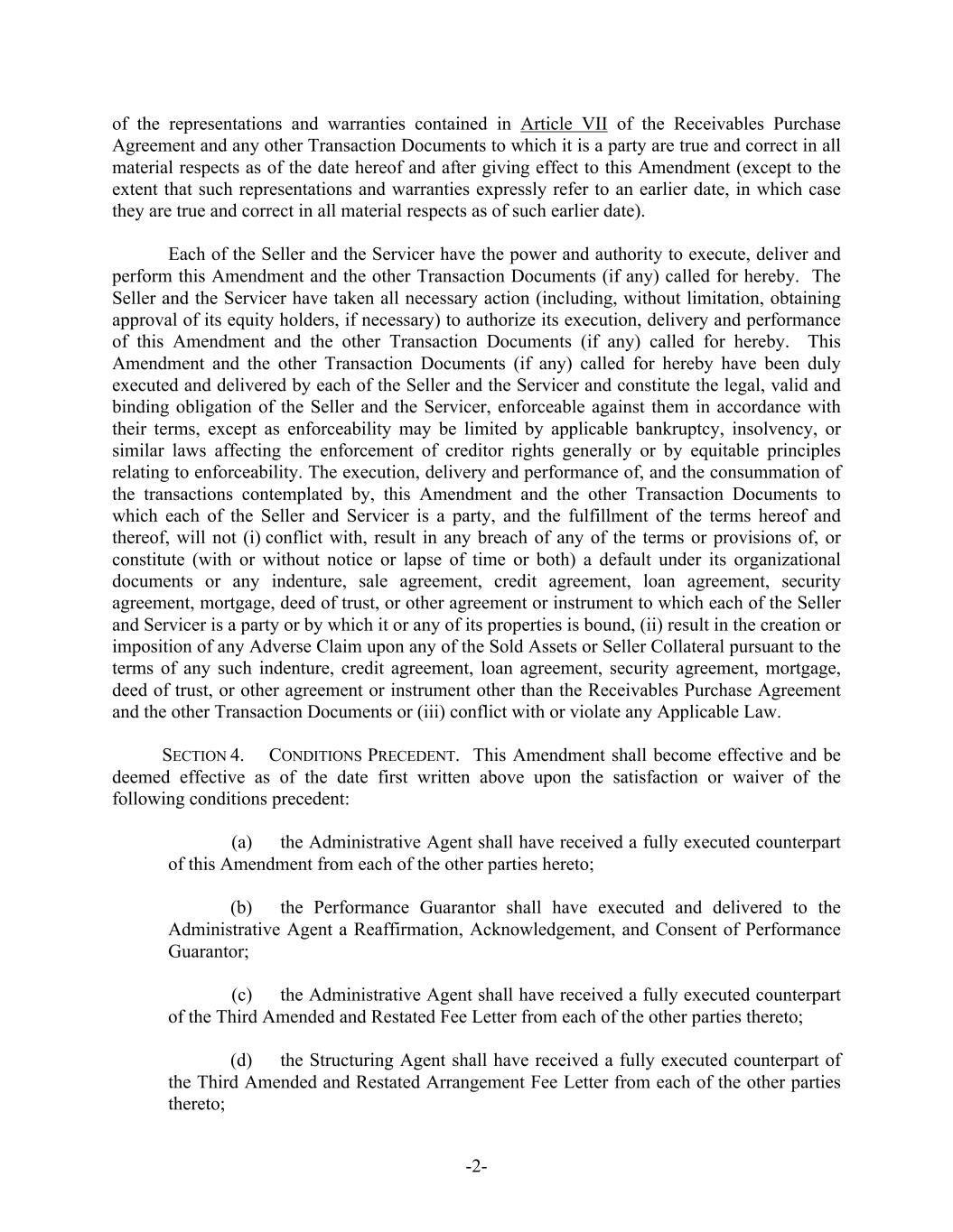-2- of the representations and warranties contained in Article VII of the Receivables Purchase Agreement and any other Transaction Documents to which it is a party are true and correct in all material respects as of the date hereof and after giving effect to this Amendment (except to the extent that such representations and warranties expressly refer to an earlier date, in which case they are true and correct in all material respects as of such earlier date). Each of the Seller and the Servicer have the power and authority to execute, deliver and perform this Amendment and the other Transaction Documents (if any) called for hereby. The Seller and the Servicer have taken all necessary action (including, without limitation, obtaining approval of its equity holders, if necessary) to authorize its execution, delivery and performance of this Amendment and the other Transaction Documents (if any) called for hereby. This Amendment and the other Transaction Documents (if any) called for hereby have been duly executed and delivered by each of the Seller and the Servicer and constitute the legal, valid and binding obligation of the Seller and the Servicer, enforceable against them in accordance with their terms, except as enforceability may be limited by applicable bankruptcy, insolvency, or similar laws affecting the enforcement of creditor rights generally or by equitable principles relating to enforceability. The execution, delivery and performance of, and the consummation of the transactions contemplated by, this Amendment and the other Transaction Documents to which each of the Seller and Servicer is a party, and the fulfillment of the terms hereof and thereof, will not (i) conflict with, result in any breach of any of the terms or provisions of, or constitute (with or without notice or lapse of time or both) a default under its organizational documents or any indenture, sale agreement, credit agreement, loan agreement, security agreement, mortgage, deed of trust, or other agreement or instrument to which each of the Seller and Servicer is a party or by which it or any of its properties is bound, (ii) result in the creation or imposition of any Adverse Claim upon any of the Sold Assets or Seller Collateral pursuant to the terms of any such indenture, credit agreement, loan agreement, security agreement, mortgage, deed of trust, or other agreement or instrument other than the Receivables Purchase Agreement and the other Transaction Documents or (iii) conflict with or violate any Applicable Law. SECTION 4. CONDITIONS PRECEDENT. This Amendment shall become effective and be deemed effective as of the date first written above upon the satisfaction or waiver of the following conditions precedent: (a) the Administrative Agent shall have received a fully executed counterpart of this Amendment from each of the other parties hereto; (b) the Performance Guarantor shall have executed and delivered to the Administrative Agent a Reaffirmation, Acknowledgement, and Consent of Performance Guarantor; (c) the Administrative Agent shall have received a fully executed counterpart of the Third Amended and Restated Fee Letter from each of the other parties thereto; (d) the Structuring Agent shall have received a fully executed counterpart of the Third Amended and Restated Arrangement Fee Letter from each of the other parties thereto;