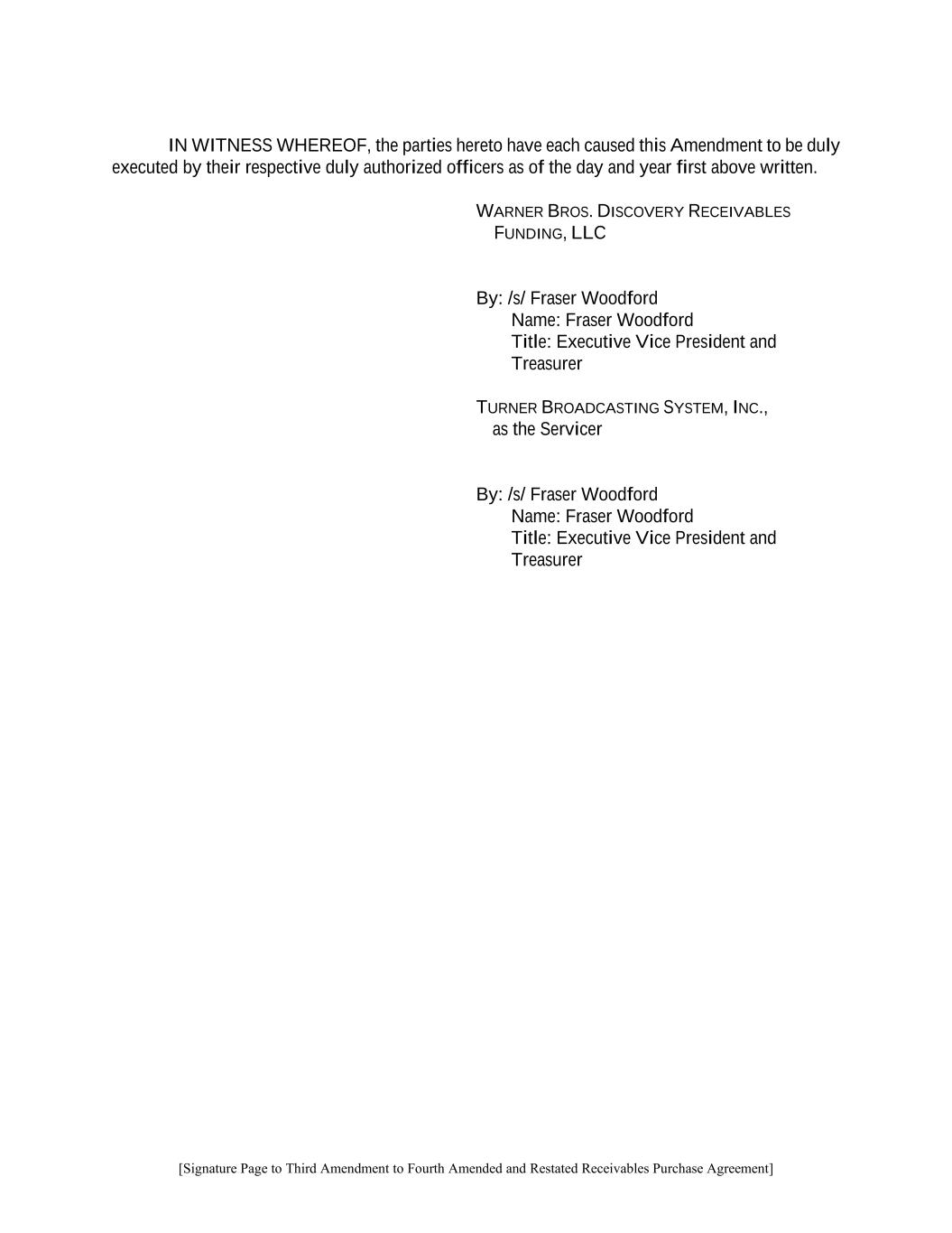 Fourth Amended and Restated Receivables Purchase Agreement IN WITNESS WHEREOF, the parties have caused this Agreement to be executed by their respective officers thereunto duly authorized, as of the date first above written. WARNER BROS. DISCOVERY RECEIVABLES FUNDING, LLC By:____________________________________ Name: _____________________________ Title: ______________________________ TURNER BROADCASTING SYSTEM, INC., as the Servicer By:____________________________________ Name: _____________________________ Title: ______________________________