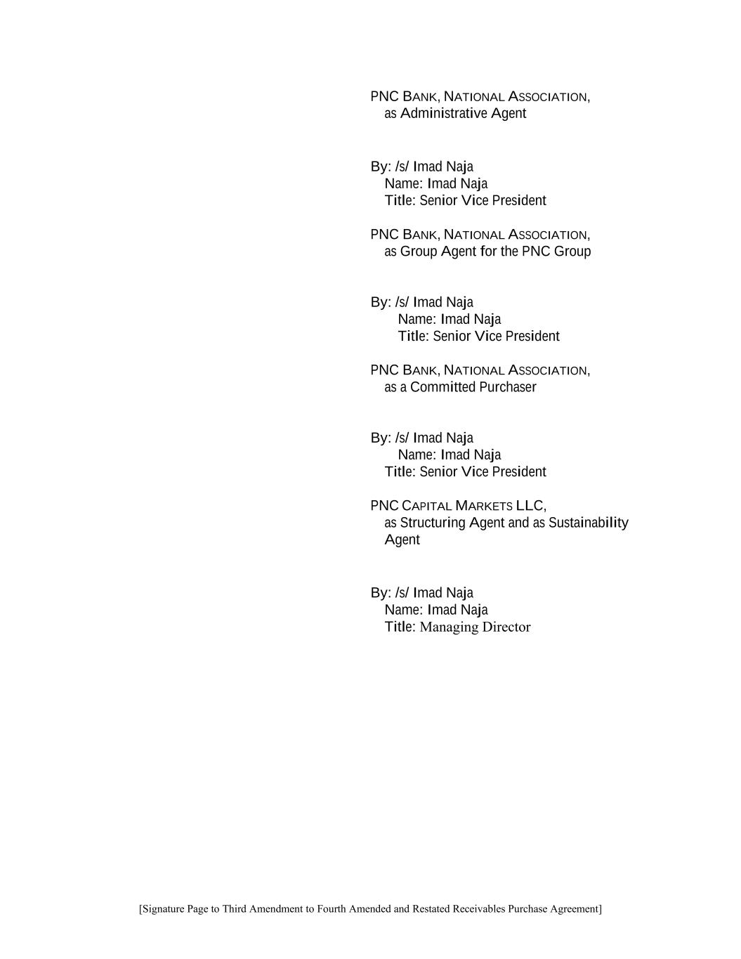 [Signature Page to Third Amendment to Fourth Amended and Restated Receivables Purchase Agreement] PNC BANK, NATIONAL ASSOCIATION, as Administrative Agent By: /s/ Imad Naja Name: Imad Naja Title: Senior Vice President PNC BANK, NATIONAL ASSOCIATION, as Group Agent for the PNC Group By: /s/ Imad Naja Name: Imad Naja Title: Senior Vice President PNC BANK, NATIONAL ASSOCIATION, as a Committed Purchaser By: /s/ Imad Naja Name: Imad Naja Title: Senior Vice President PNC CAPITAL MARKETS LLC, as Structuring Agent and as Sustainability Agent By: /s/ Imad Naja Name: Imad Naja Title: Managing Director