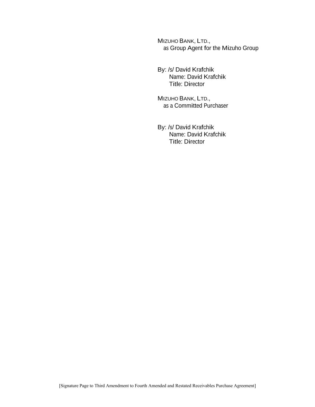 [Signature Page to Third Amendment to Fourth Amended and Restated Receivables Purchase Agreement] MIZUHO BANK, LTD., as Group Agent for the Mizuho Group By: /s/ David Krafchik Name: David Krafchik Title: Director MIZUHO BANK, LTD., as a Committed Purchaser By: /s/ David Krafchik Name: David Krafchik Title: Director