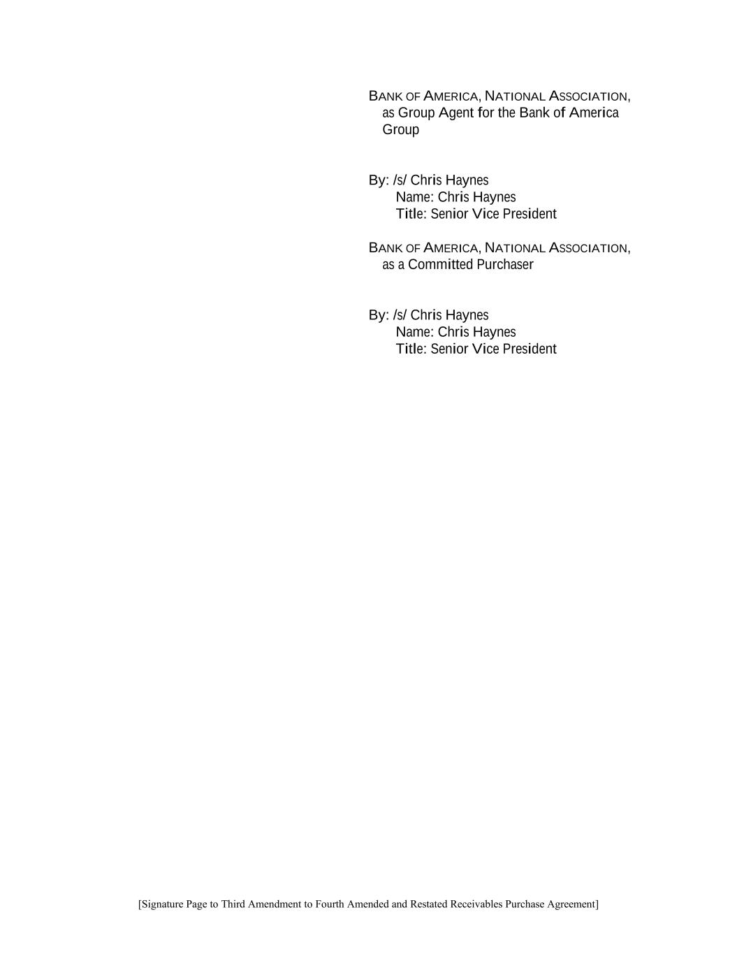 [Signature Page to Third Amendment to Fourth Amended and Restated Receivables Purchase Agreement] BANK OF AMERICA, NATIONAL ASSOCIATION, as Group Agent for the Bank of America Group By: /s/ Chris Haynes Name: Chris Haynes Title: Senior Vice President BANK OF AMERICA, NATIONAL ASSOCIATION, as a Committed Purchaser By: /s/ Chris Haynes Name: Chris Haynes Title: Senior Vice President