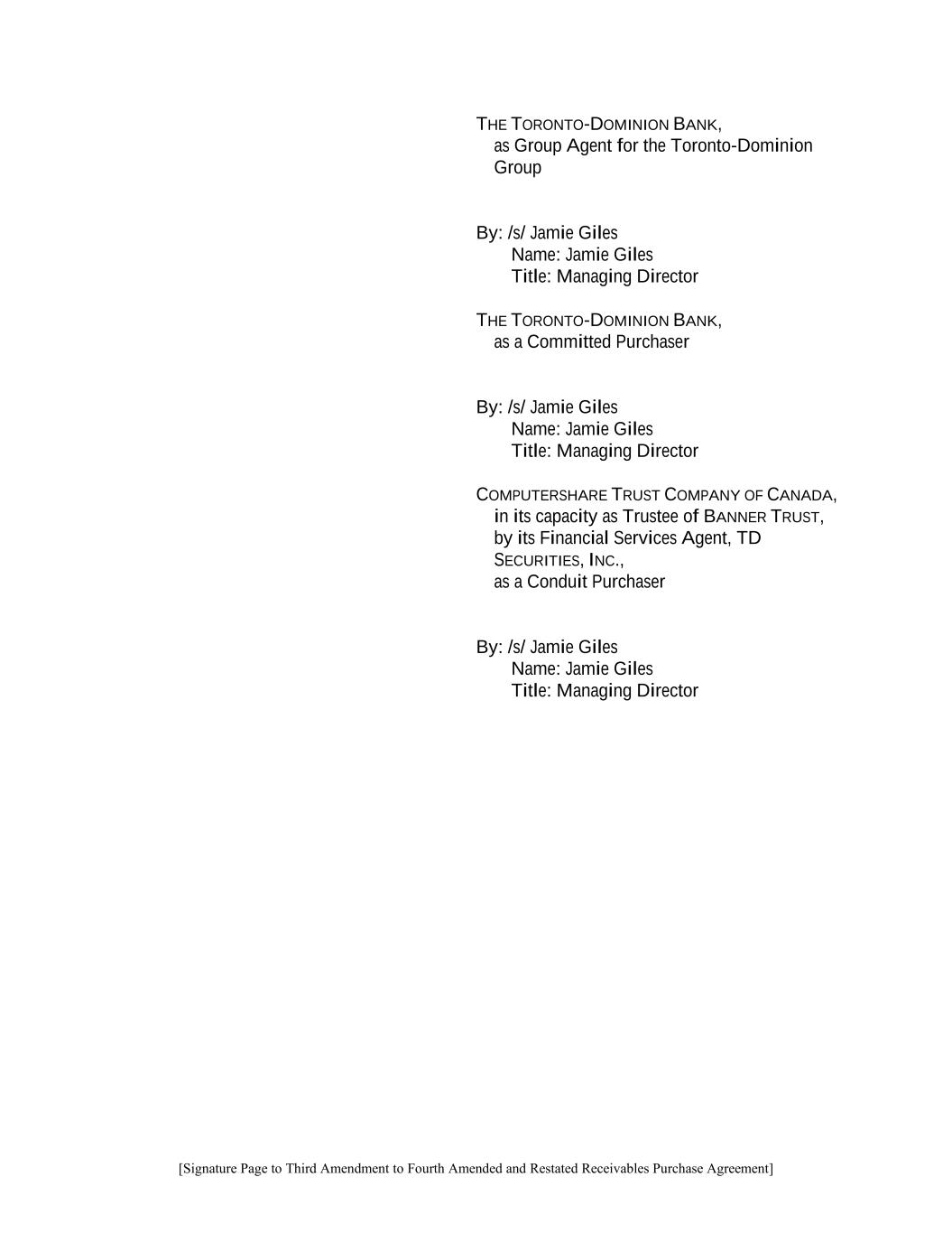 [Signature Page to Third Amendment to Fourth Amended and Restated Receivables Purchase Agreement] THE TORONTO-DOMINION BANK, as Group Agent for the Toronto-Dominion Group By: /s/ Jamie Giles Name: Jamie Giles Title: Managing Director THE TORONTO-DOMINION BANK, as a Committed Purchaser By: /s/ Jamie Giles Name: Jamie Giles Title: Managing Director COMPUTERSHARE TRUST COMPANY OF CANADA, in its capacity as Trustee of BANNER TRUST, by its Financial Services Agent, TD SECURITIES, INC., as a Conduit Purchaser By: /s/ Jamie Giles Name: Jamie Giles Title: Managing Director